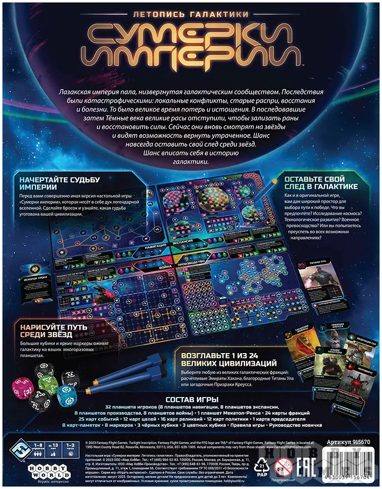 "Летопись галактики" – это абсолютно иная версия настольного гиганта "Сумерки империи", которая также несёт в себе дух огромной вселенной. Ровно как в оригинале у вас будет большой простор для развития и выбора собственного пути к победе! Решите ли вы отправиться на исследование космоса или вложите свои ресурсы в технологическое развитие? А может, вам по душе решение вопросов грубой силой? Тогда военное превосходство – ваш вектор развития. Но ничего не мешает вам вести свою цивилизацию ко всестороннему развитию. Кстати о цивилизациях, в игре на выбор их представлено целых 24! Выбирайте любую и ведите её к процветанию!
