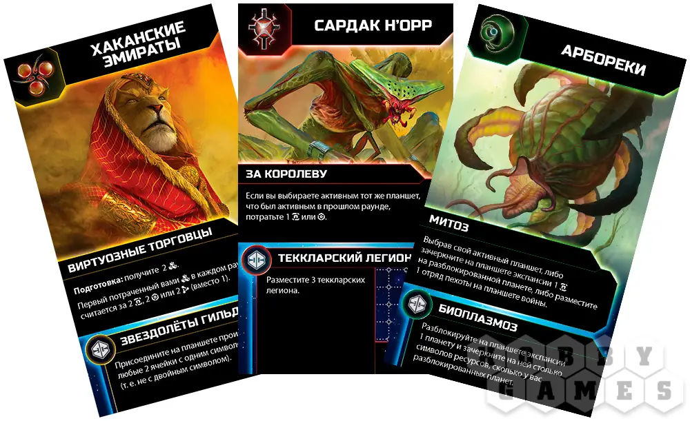 Военные – отражают напряжение между фракциями. Когда такая карта раскрыта, игроки разыгрывают войну против каждого своего соседа