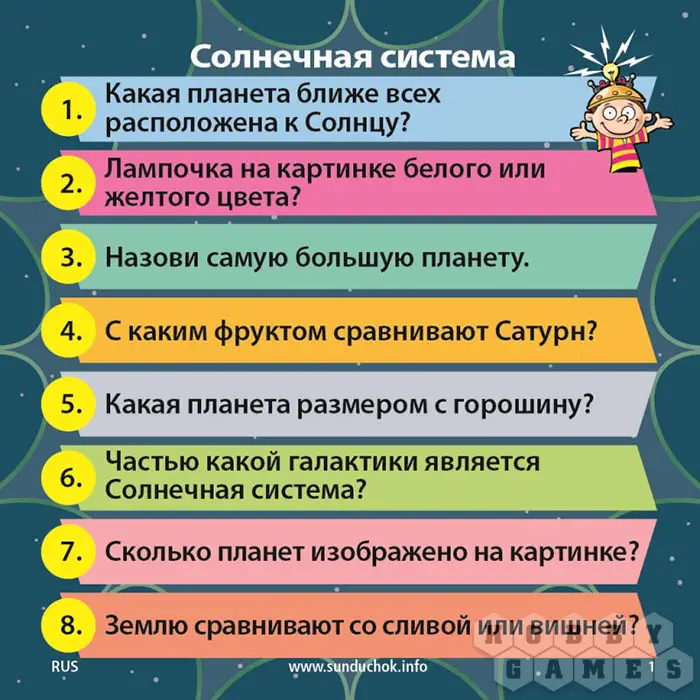 Настало время отправиться в яркое и познавательное космическое путешествие. Вашим звёздным штурманом станут простые правила нашей игры, а в роли новых планет выступят 70 карточек с интересными вопросами по тематике Космоса.