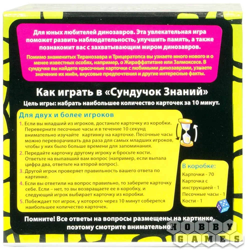 А вы знали, что "Спинозавр" означает "шипастый ящер"? А что Анкилозавр по размеру и форме был похож на танк? А ещё, например, у Пситтакозавра был клюв, но не было зубов, а его название означает "ящерица-попугай"! Множество интересных фактов и каверзных вопросов ждут вас в настольной игре "Сундучок знаний "Мир динозавров".
