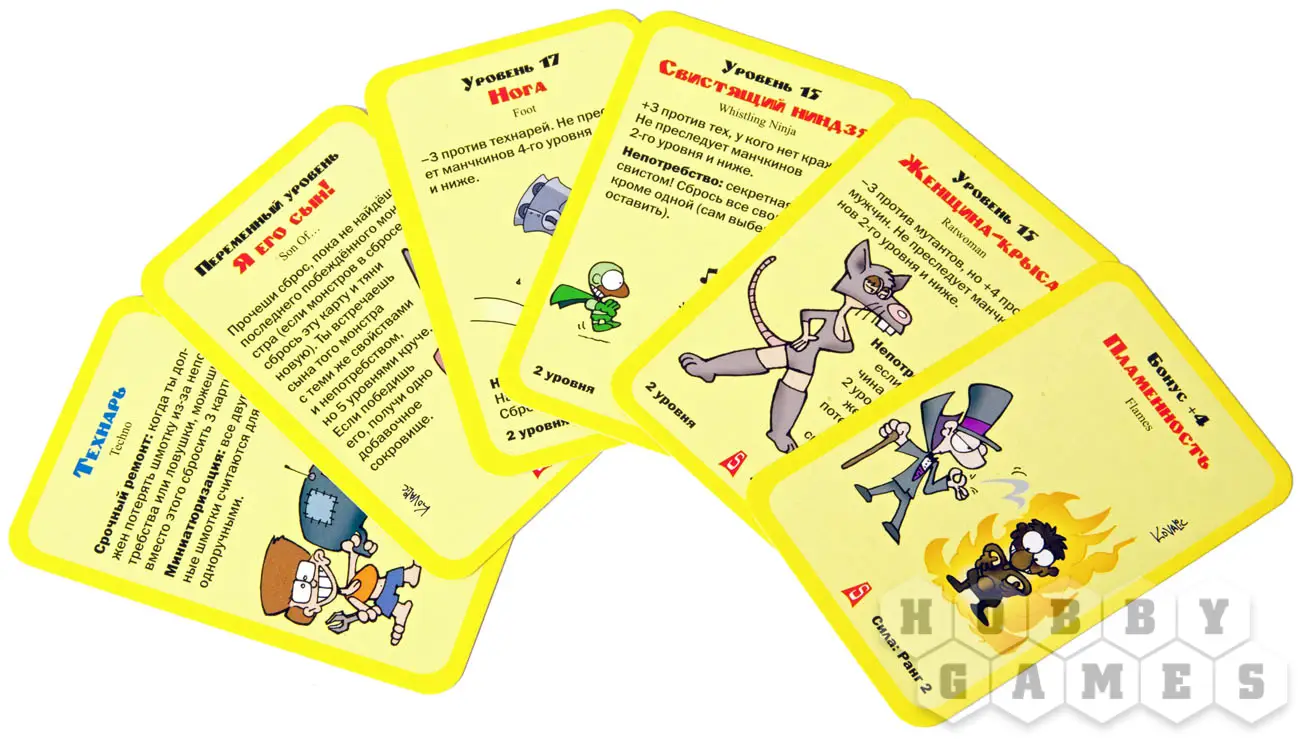 Если это карта монстра, то вам повезло (или нет?) и придётся вступить с ним в бой. Когда сила игрока больше или равна силе монстра, тогда игрок побеждает и может взять столько карт сокровищ, сколько указано на карте с монстром. Во время боя другие игроки могут помогать товарищу и вступить с ним в бой, или же мешать и всячески усиливать вылезшего врага. Если игрок побеждает в бою, то он получает опыт и уровни. По течению партии игроки будут применять на себя разные классы и профессии, менять свой пол, напяливать различные шмотки, пить подозрительные зелья, а также сражать самых разнообразных монстров – всё для того, чтобы как следует увеличить силу своего манчкина и добраться до максимального уровня.
