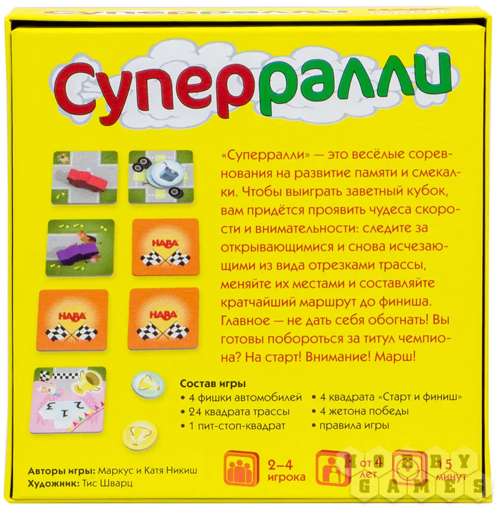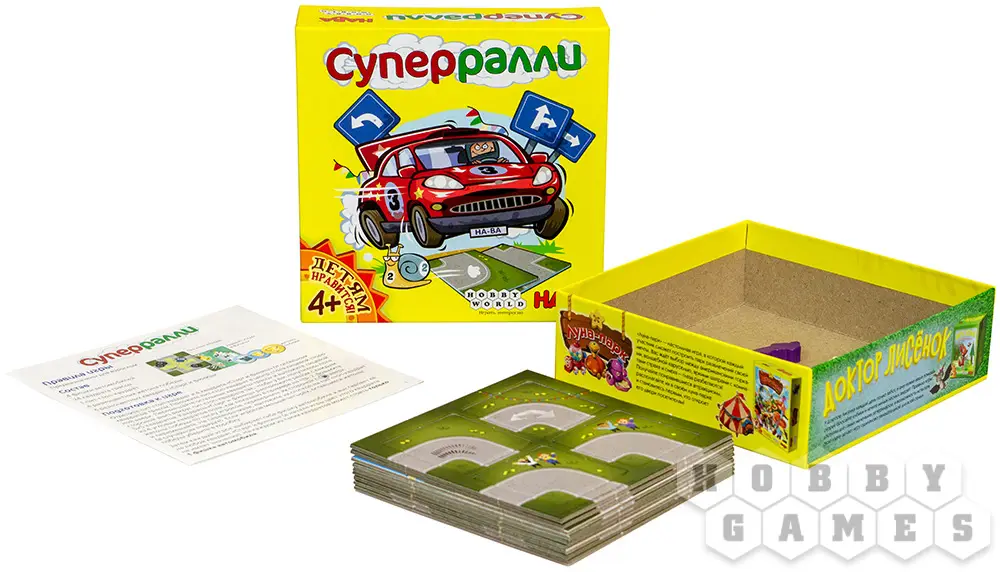 "Суперралли" – настольная игра для семейного досуга с детьми, представляющая собой весёлые гонки по трассе. Однако, игра потребует от вас не скорости реакции, а хорошей памяти и сообразительности, поэтому игра отлично подойдёт в качестве развивающей.