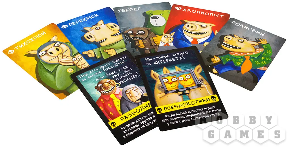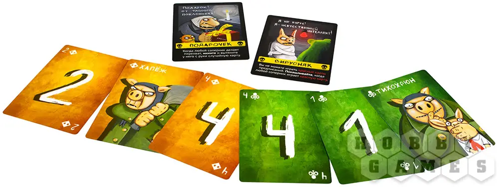 Кроме цифровых карт с номиналом, в игре есть специальные карты. Каждая такая карта обладает уникальным эффектом, который превращают игру в концентрированное веселье. "Тихосвин", например, запрещает на один круг издавать любые звуки, а "Хлопкопыт" заставит проявить рефлексы...