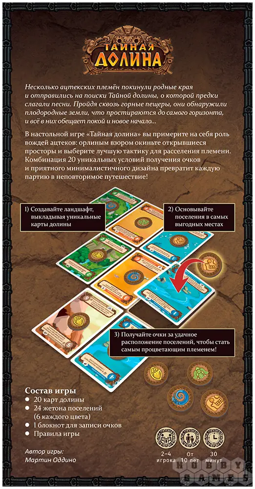 "Тайная долина" – это карточная настольная игра, в которой вы возьмёте на себя роль вождя одного из кланов, обосновавшихся на новой территории, и постараетесь привести его к процветанию. Вы будете разыгрывать карты долины, комбинируя между собой различные типы местности таким образом, чтобы активировать на них условие получения победных очков. Только грамотное планирование и видение грамотных тактик приведёт ваш народ к успеху.