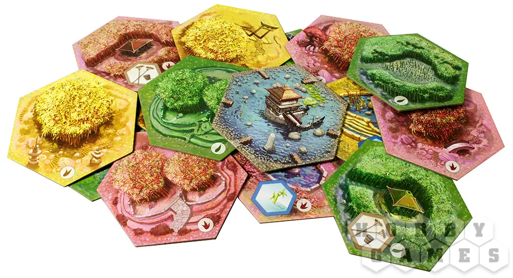 Выложить новый участок – игрок выбирает один из трёх вытянутых участков сада и выкладывает его в сад таким образом, чтобы участок соприкасался либо с прудом, либо с двумя любыми другими участками. Таким образом расширяется общий сад игроков. Сами участки могут быть с улучшениями, а могут быть без них, к тому же на участках растут различные сорта бамбука