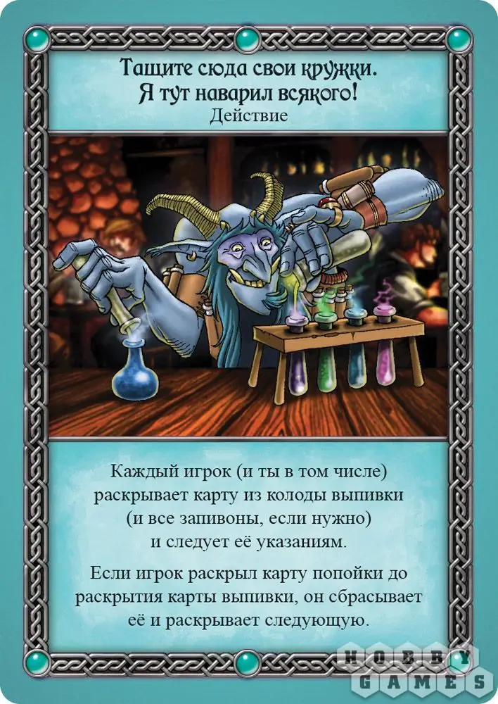 • Заказ выпивки – Вы должны взять верхнюю карту из колоды Выпивки и положить её взакрытую любому игроку! Угощайся, друже! Если колода выпивки пуста, все игроки должны заплатить по 1 золотому, чтобы из погреба принесли ещё пойла!