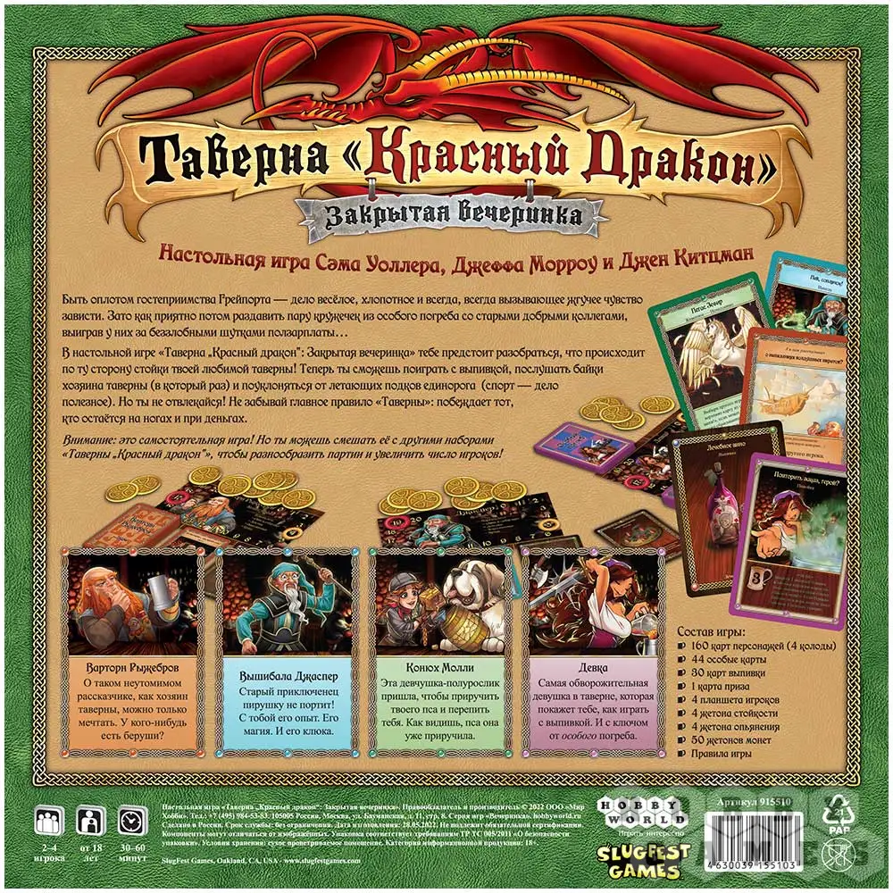 "Таверна "Красный дракон": Закрытая вечеринка" – новая самостоятельная часть серии популярной карточной игры. На этот раз вы окажетесь по ту сторону барной стойки вашего любимого заведения: играйте с выпивкой, уворачивайтесь от летящих во все стороны подков, слушайте байки хозяина (как будто до этого их ни разу не слышали). Но не вздумайте отвлекаться, вы же помните самое главное правило? Кто остался на ногах, того и деньги!