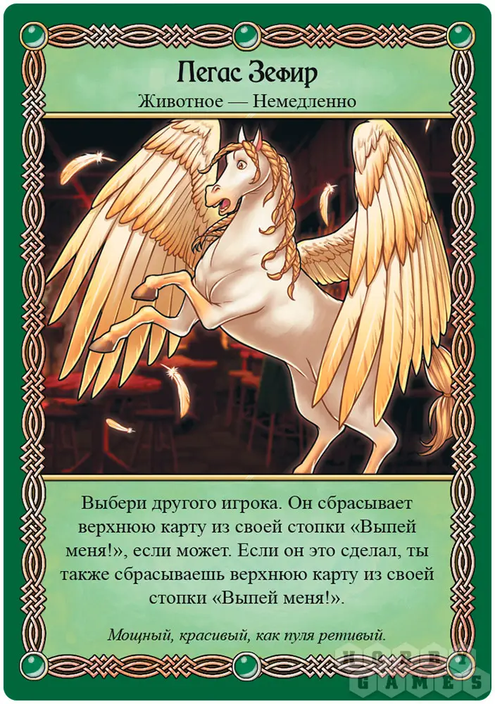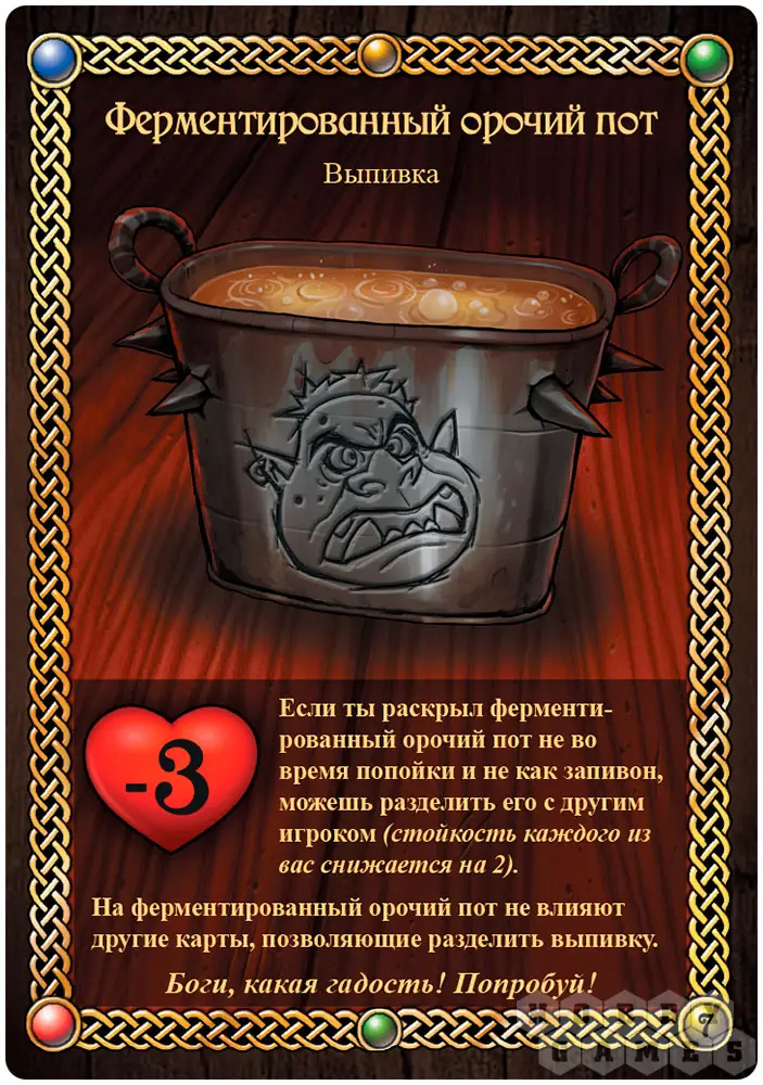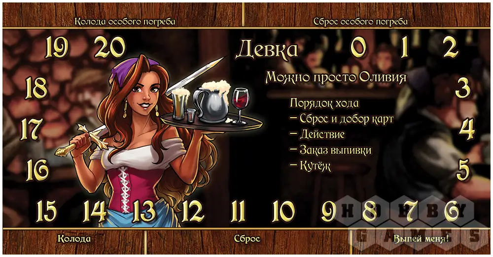 Заказ выпивки – вы должны взять верхнюю карту из колоды Выпивки и положить её взакрытую любому игроку! Угощайся, друже! Если колода выпивки пуста, все игроки должны заплатить по 1 золотому, чтобы из погреба принесли ещё пойла!