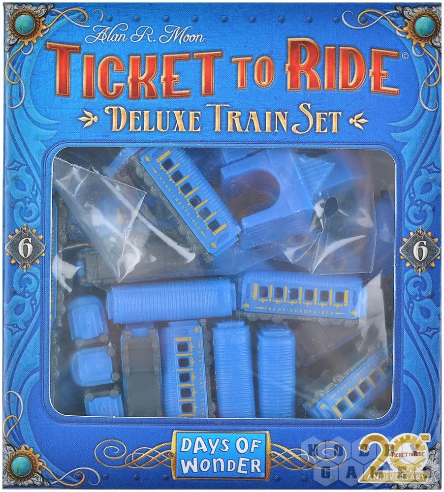 Представляем вашему вниманию делюкс-набор с тремя станциями, маркером подсчёта очков и изящными вагончиками синего цвета. Благодаря им вы сможете, словно наяву, отправиться в путешествие по Европе конца XX века. Роскошные вагоны с полноценными спальнями, вагоны-рестораны с вкуснейшим яствами, салоны, столь знакомые нам по многим фильмам, – всё это окружает таким комфортом, что и забываешь, что находишься в поезде, а не у себя дома.