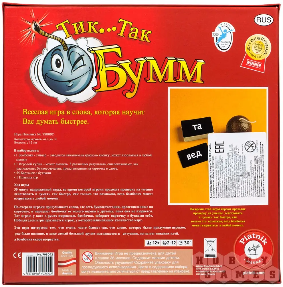 Хотите проверить свой лексикон и то насколько быстро вы сможете вспоминать нужные слова держа у себя в руках взведённую бомбу? Бомба конечно игрушечная, но от этого "Тик Так Бум" не становится менее интересной и захватывающей настольной игрой для детей.