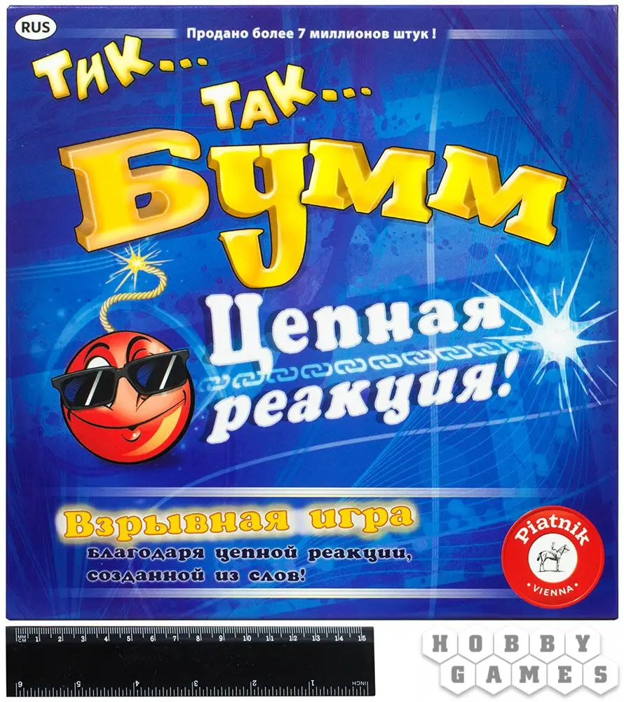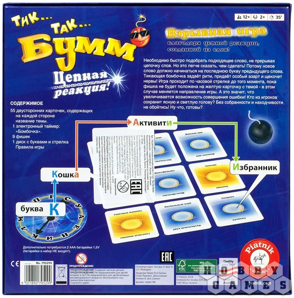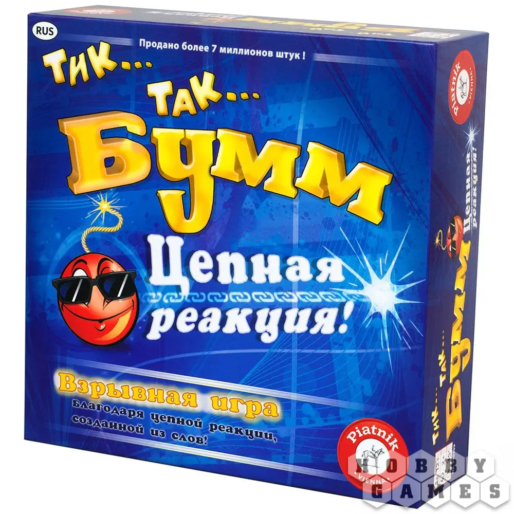 Приготовьтесь к взрывному развлечению! Настольная игра для весёлой компании "Тик Так Бумм Цепная реакция" испытает вашу реакцию и находчивость. В процессе игры вам надо будет продолжать цепочку из слов, быстро подбирая слова, которые начинаются на последнюю букву предыдущего слова.