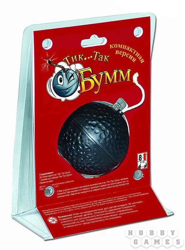 "Тик Так Бум" - игра очень простая и динамичная. А играть в неё нескучно как вдвоём, так и большой компанией до 12 человек. В одном раунде игры используется 13 карточек, а специальный игровой кубик с тремя вариантами жребия определяет, как расположить сочетание букв с карточки в придуманном слове. Но самое главное, сделать это как можно быстрее, ведь бомба может взорваться в любой момент, и тогда карточка остаётся у ходившего игрока. Затем всё повторяется снова. Победу празднует тот, кто сумеет в конце игры собрать наименьшее количество карточек.