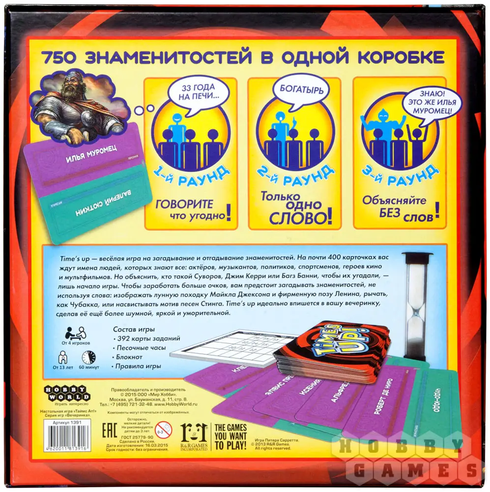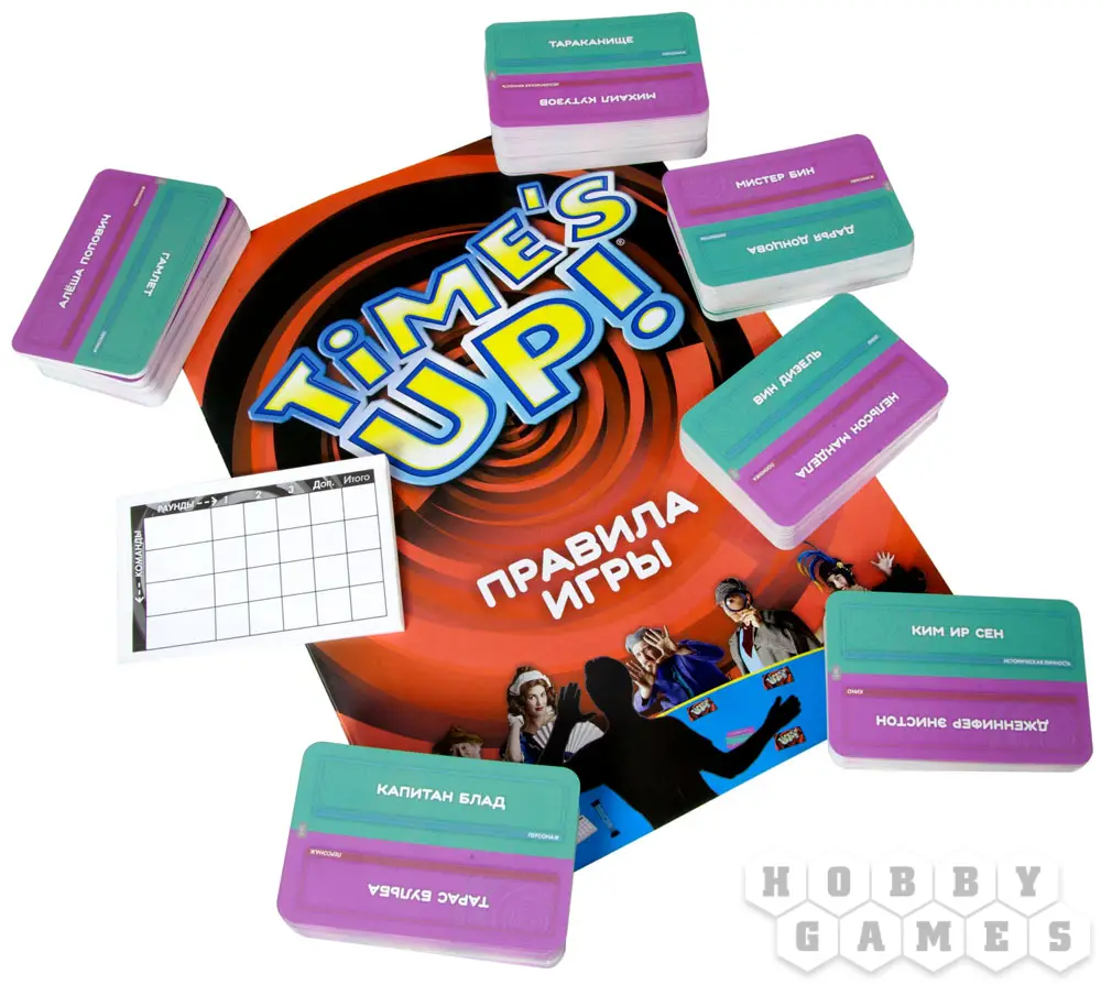 Сколько знаменитых актёров, учёных, музыкантов, политиков, спортсменов и персонажей фильмов и мультфильмов вы знаете? Настольная игра «Time's Up!» поможет вам выяснить это! Загадывайте и угадывайте известных людей и героев. Но описать их с помощью слов - только первый этап. Для того чтобы набрать больше очков объясняйте имена, используя свою смекалку и актёрские таланты, давайте чёткие ассоциации или изображайте известные роли!