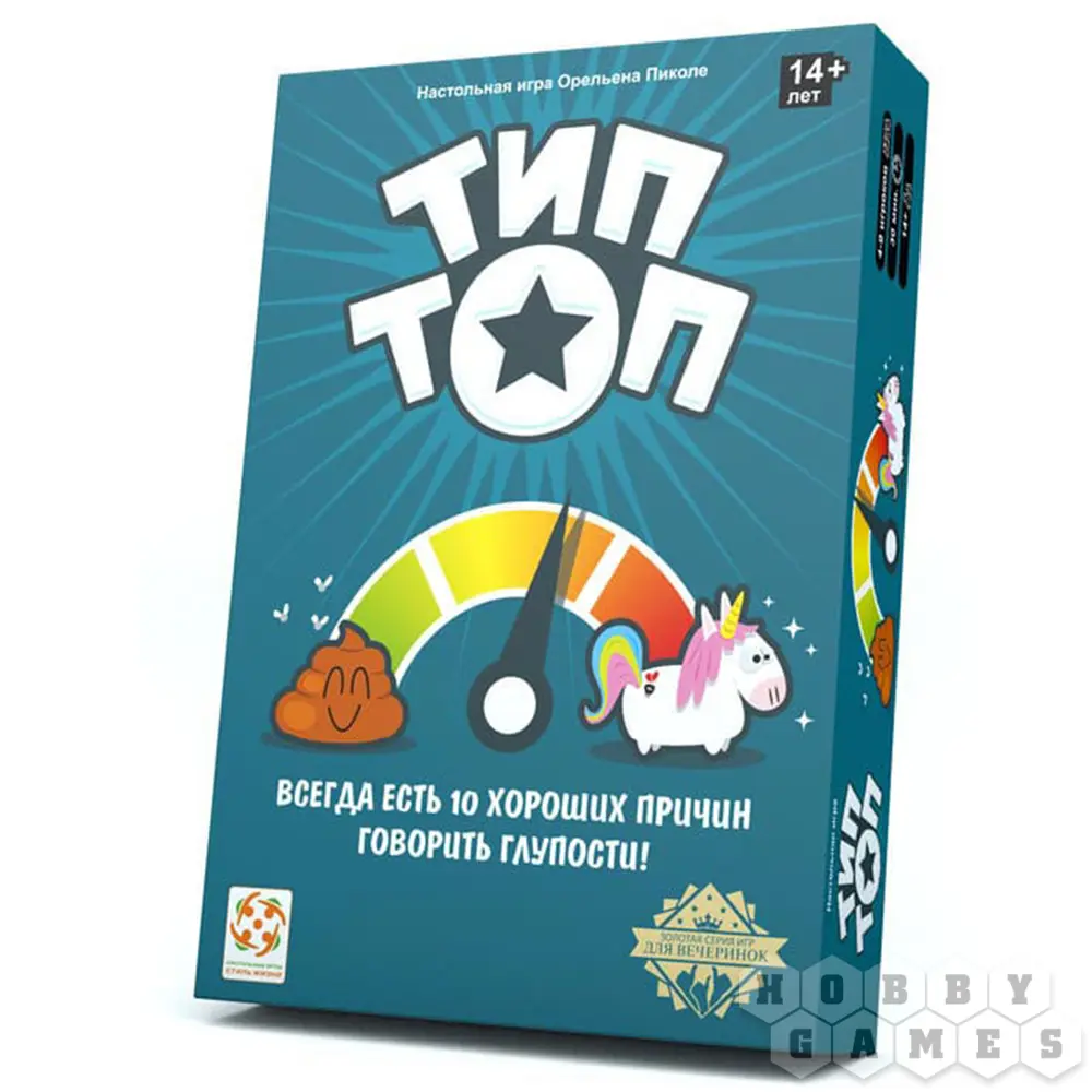 "Тип Топ" - веселая игра для дружной компании. Легкие и понятные правила, два уровня сложности, интересное оформление с единорожками - сделают ваш вечер незабываемым. В каждом раунде ведущий берет карту с темами и зачитывает любую на свой выбор. Задача участников - дать ответ, соответствующий номеру на карте (от 1 до 10). Проверьте, на одной ли волне вы со своими друзьями!