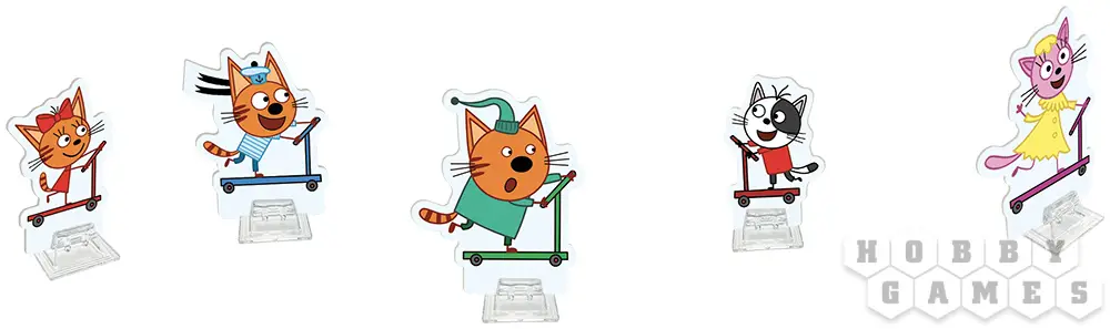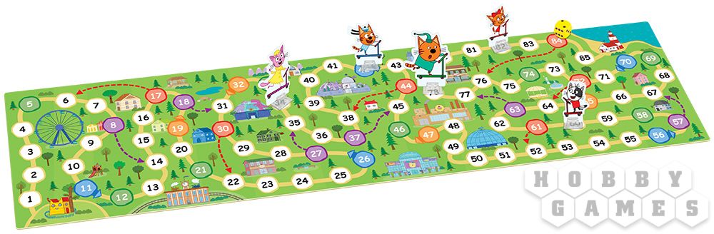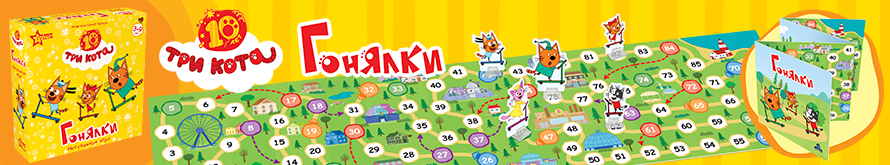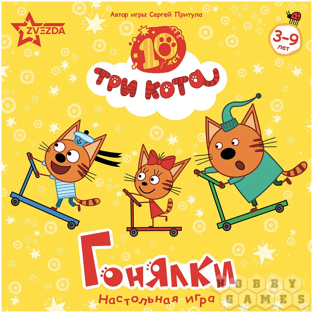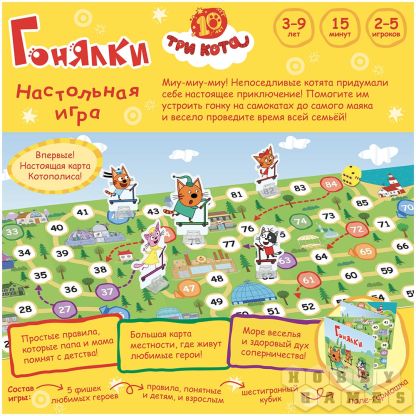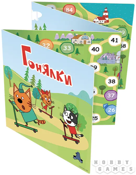 "Три кота: Гонялки" – это настольная игра для детей и их родителей, созданная по мотивам популярного мультсериала. Игровое поле представляет собой большую красочную карту местности, где живут любимые герои – от старта у домика котят до финиша у маяка.