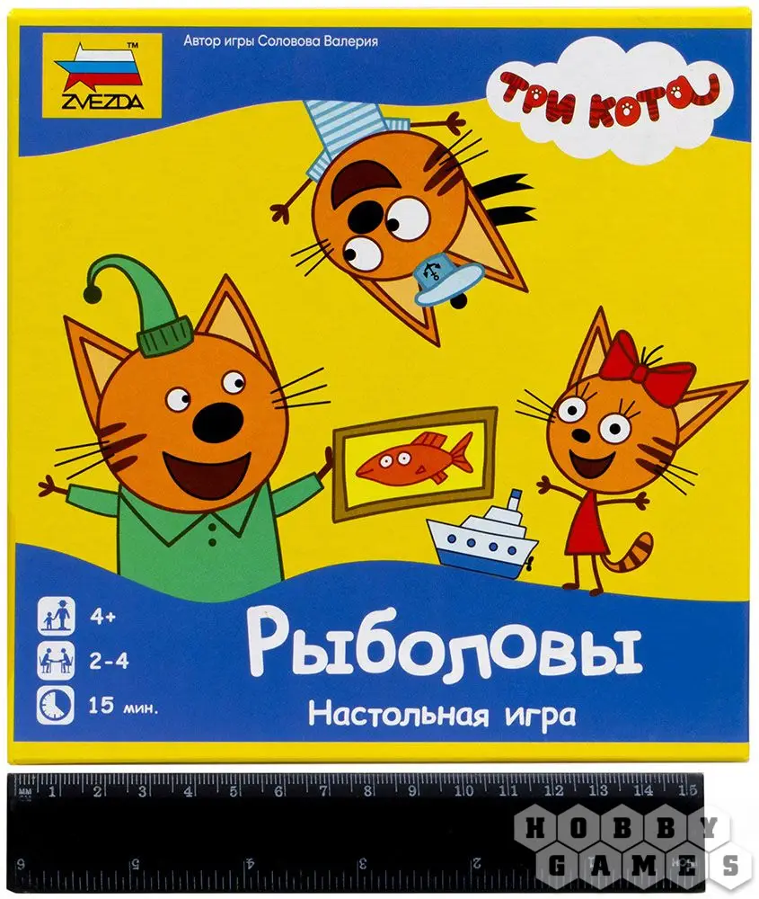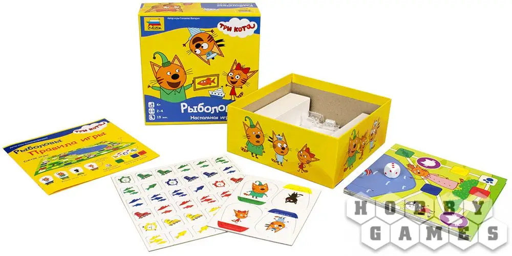 В настольной игре "Три кота. Рыболовы" игроки отправляются на рыбалку к озеру, чтобы принести домой самый большой улов. Механика простая – бросайте кубики и перемещайте своего котёнка на выпавшее число шагов и подбирайте фишку с уловом.