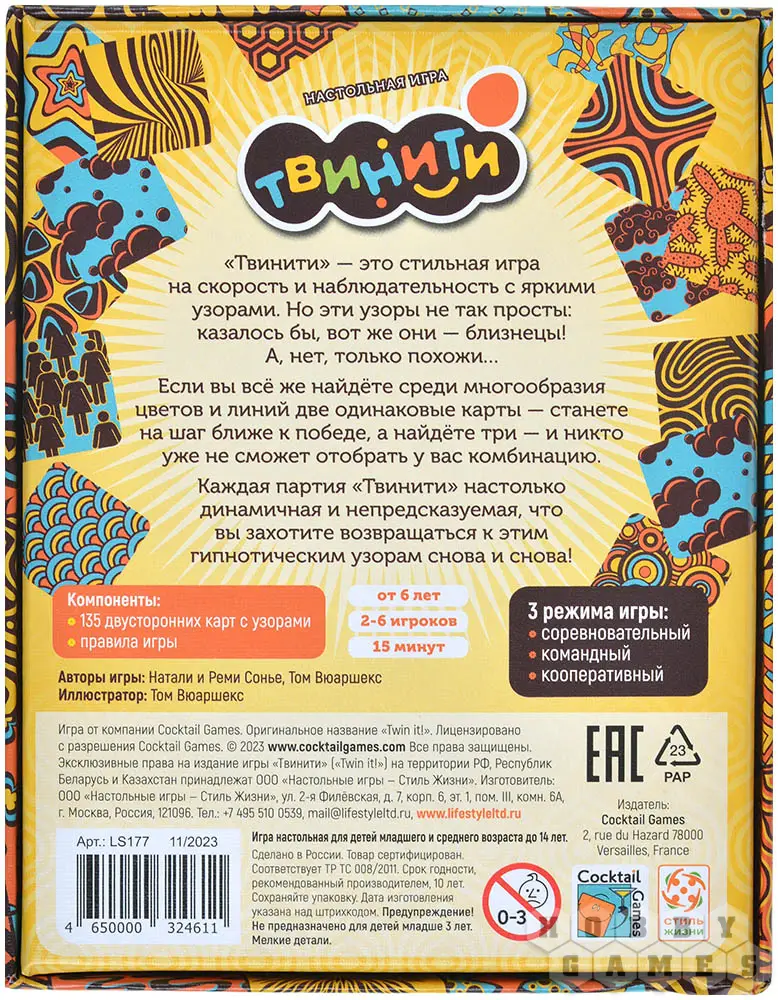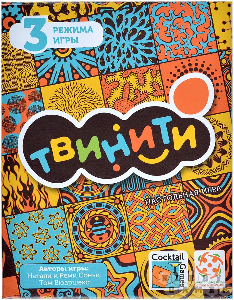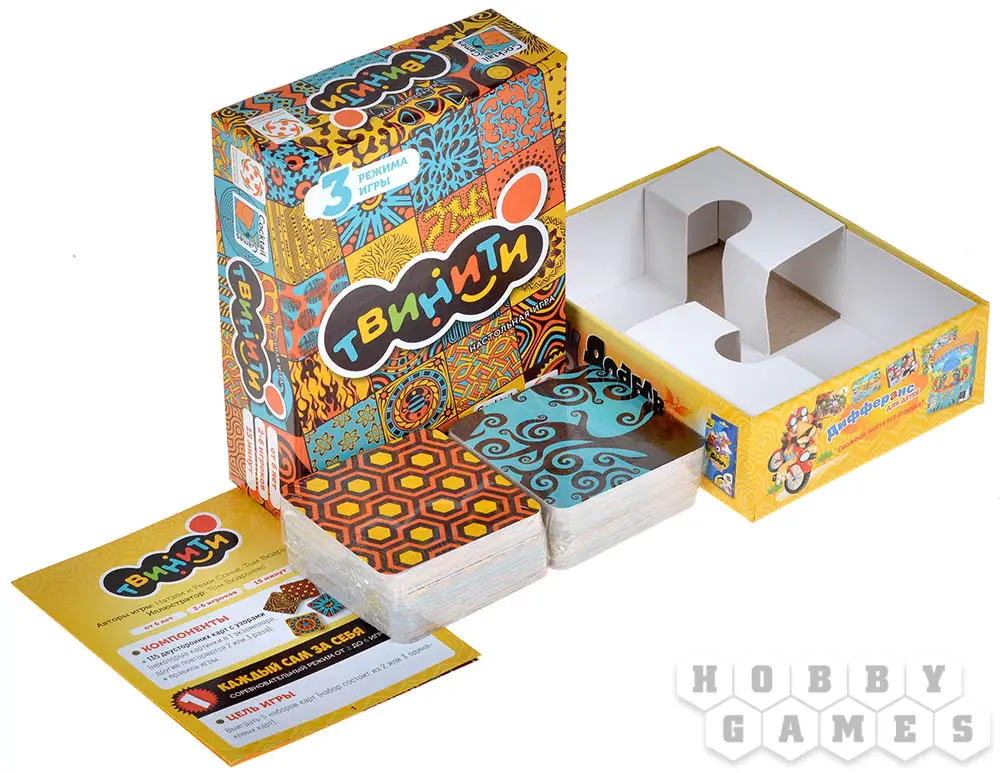 Проверьте насколько вы наблюдательны! “Твинити” – динамичная настольная игра, которая будет удивлять вас каждый раз. В коробке 135 двухсторонних уникальных карточек с разнообразными узорами, некоторые их которых повторяются 2 или 3 раза, а другие представлены только раз. Простор для воображения огромный! Узоры могут отличаться фигурами, оттенками цветов, так что будьте предельно внимательны, ищите одинаковые и побеждайте!