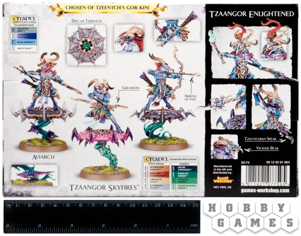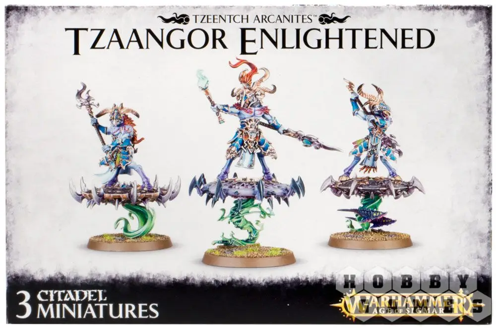 Воистину возлюбленные Тзинчем, Просвещенные Тзаангоры вооружены копьями, а головы их украшены странными и великолепными рогами. Некоторые Просвещенные даже седлают диски Тзинча и отправляются в бой верхом на них. Просвещенным дано знание прошлого - враги трясутся в суеверном страхе, когда эти Тзааногоры вещают о событиях их жизней, о которых никто не должен был знать.