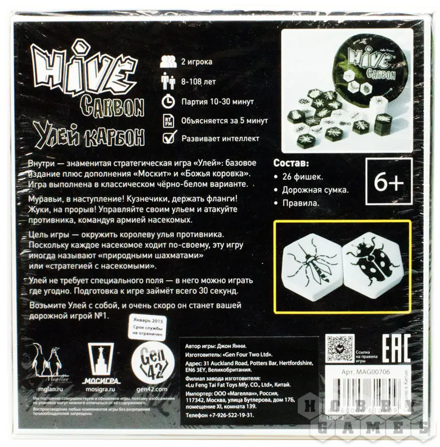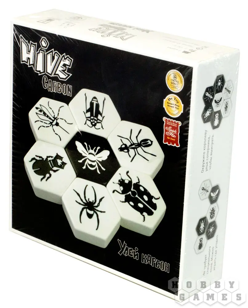 Во-первых, для игры вам не нужно поле, играть можно буквально на любой поверхности. Во-вторых, изначальное расположение фигур будет меняться от партии к партии, что привносит огромное разнообразие в игру. В-третьих, фигуры насекомых выполнены в виде приятных на ощупь шестиугольных плиток — гексов. Такая форма обусловлена названием игры и некоторыми интересными правилами, которые мы рассмотрим ниже.