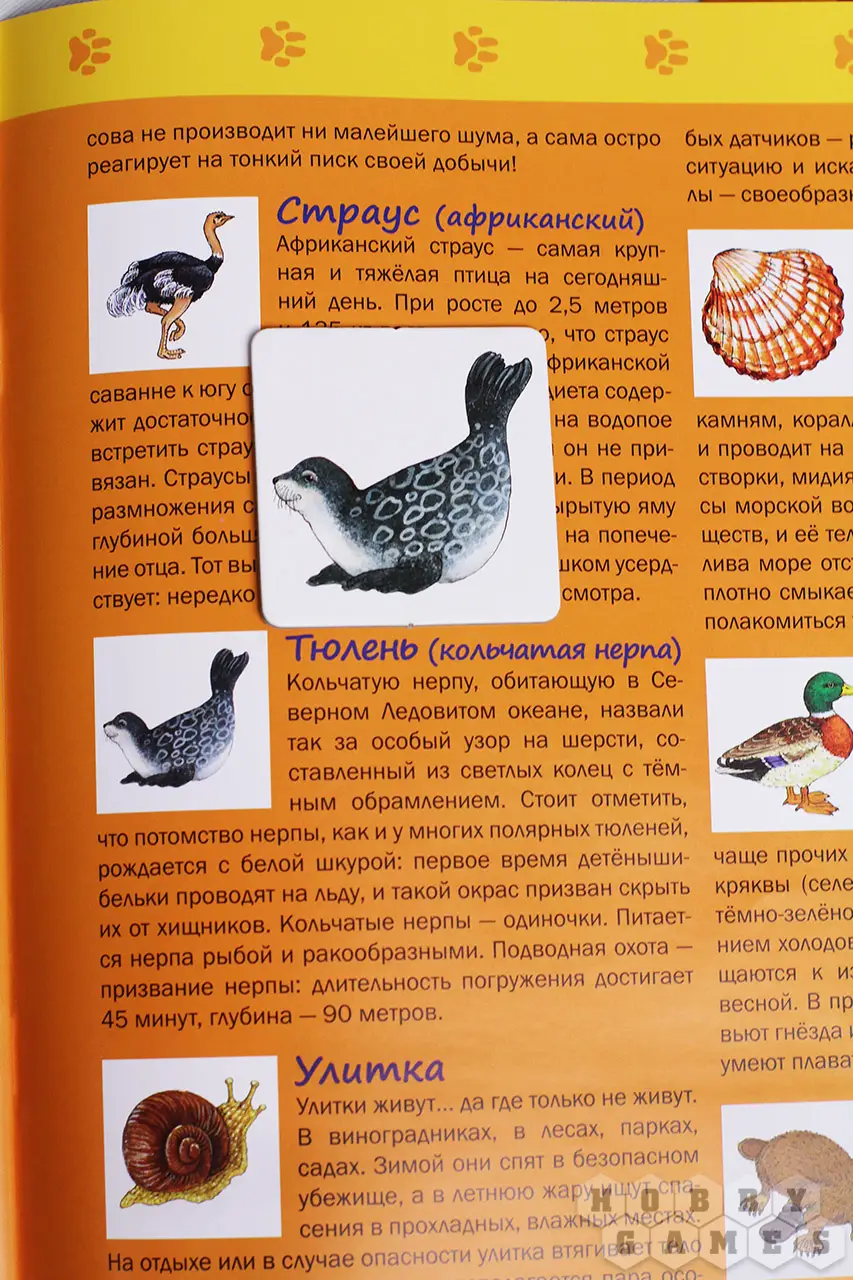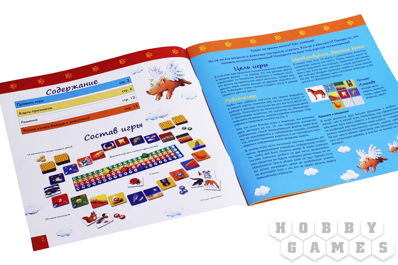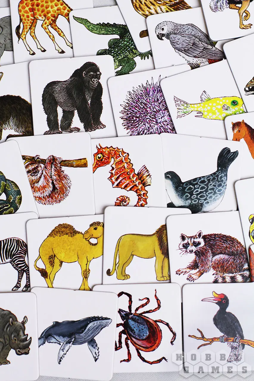 Целых 60 животных, от слона до мухи, подробно и понятно разобраны в правилах. Это игра не только на реакцию, но и на знания!