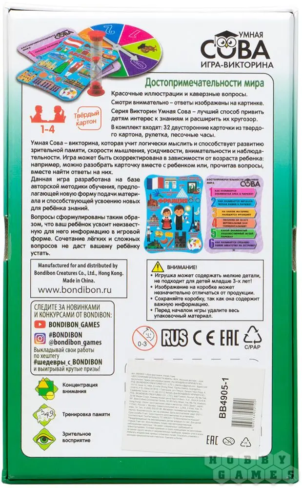 "Умная сова" – настольная викторина, которая расширит кругозор, научит рассуждать логически, разовьёт зрительную память, а также поспособствует развитию у ребёнка внимательности и скорости мышления.