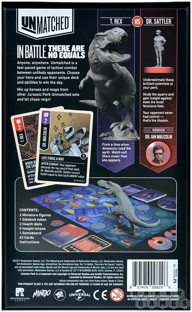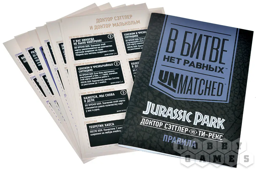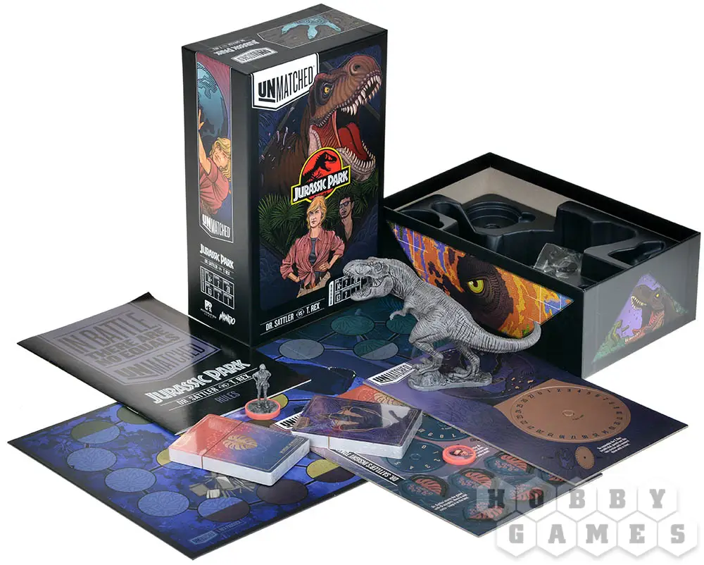 В настолках серии Unmatched встречаются настоящие легенды, сошедшие с экранов, и персонажи из древних сказаний и легенд. Чтобы сразиться в эпической борьбе! Стратегия и стиль каждый бойца по-своему уникальны. В игре Unmatched: Jurassic Park. Dr. Sattler vs. T. Rex встречаются учёный и величайший хищник всех времён. Кто одержит победу: разум или инстинкты?