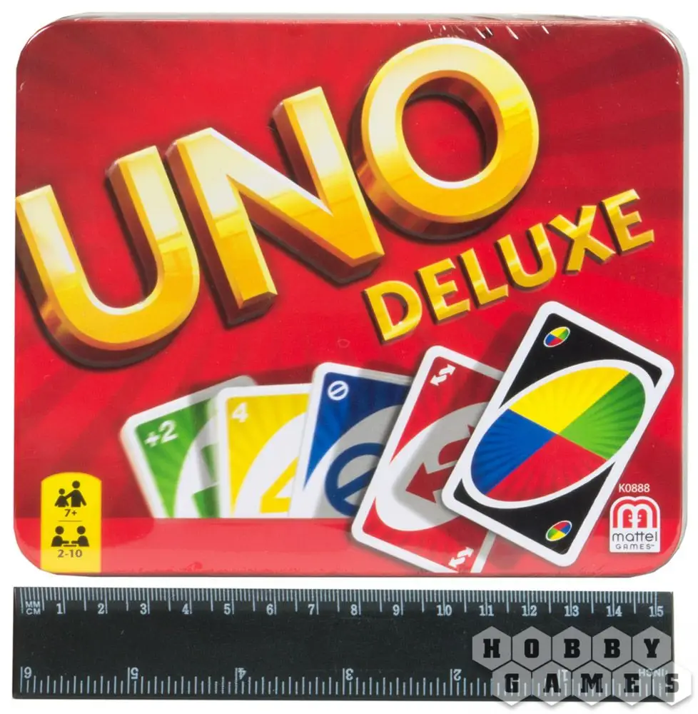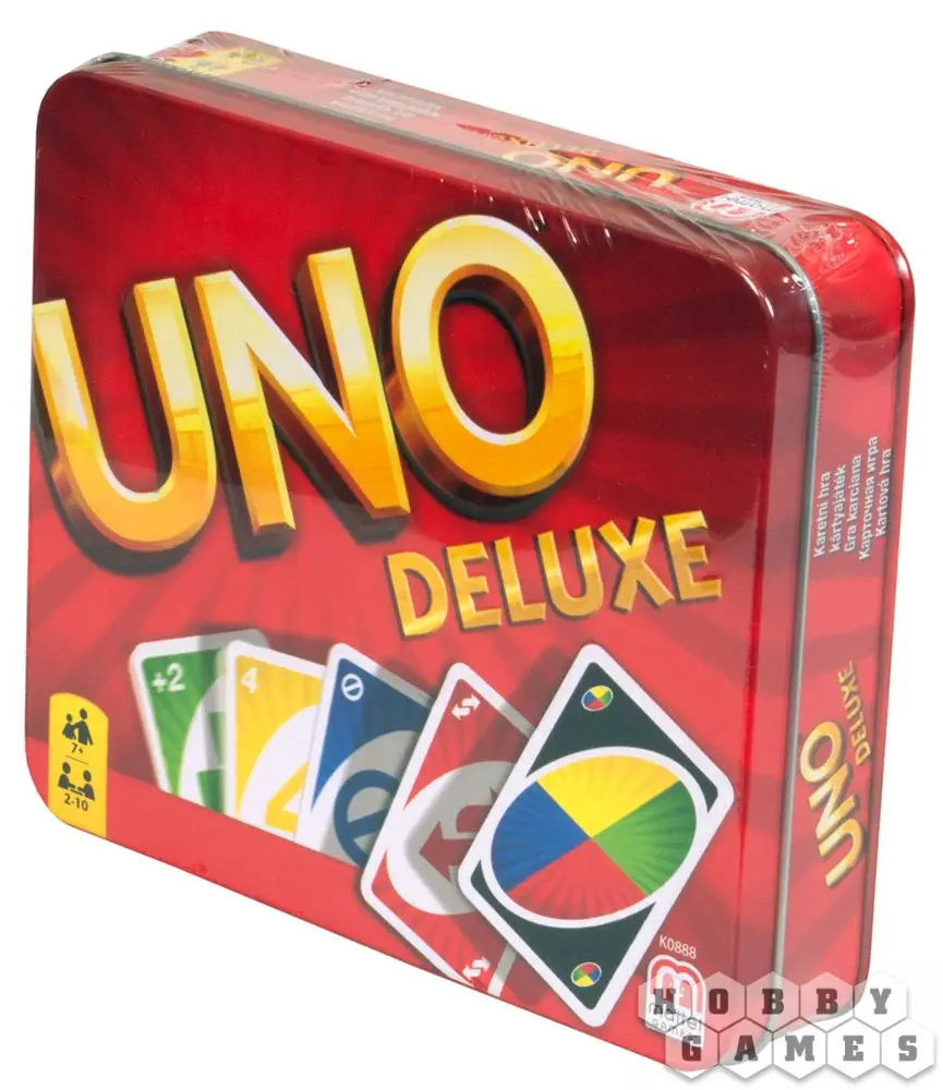 Издание «УНО Делюкс» предлагает вам уникальную упаковку для хранения игры и её компонентов, специальную подставку для колод, блокнот и карандаш для удобного подсчёта очков, а также уникальную рубашку на самих картах.