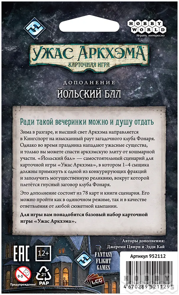 "Ужас Аркхэма. Карточная игра" – это кооперативная Живая Карточная Игра в сеттинге мифов Лавкрафта, в которой 1-2 сыщика (а со вторым набором – 3-4) смогут совместно познакомиться с миром оккультизма, древних богов и тайн, параллельно борясь и со своими внутренними демонами из прошлого.