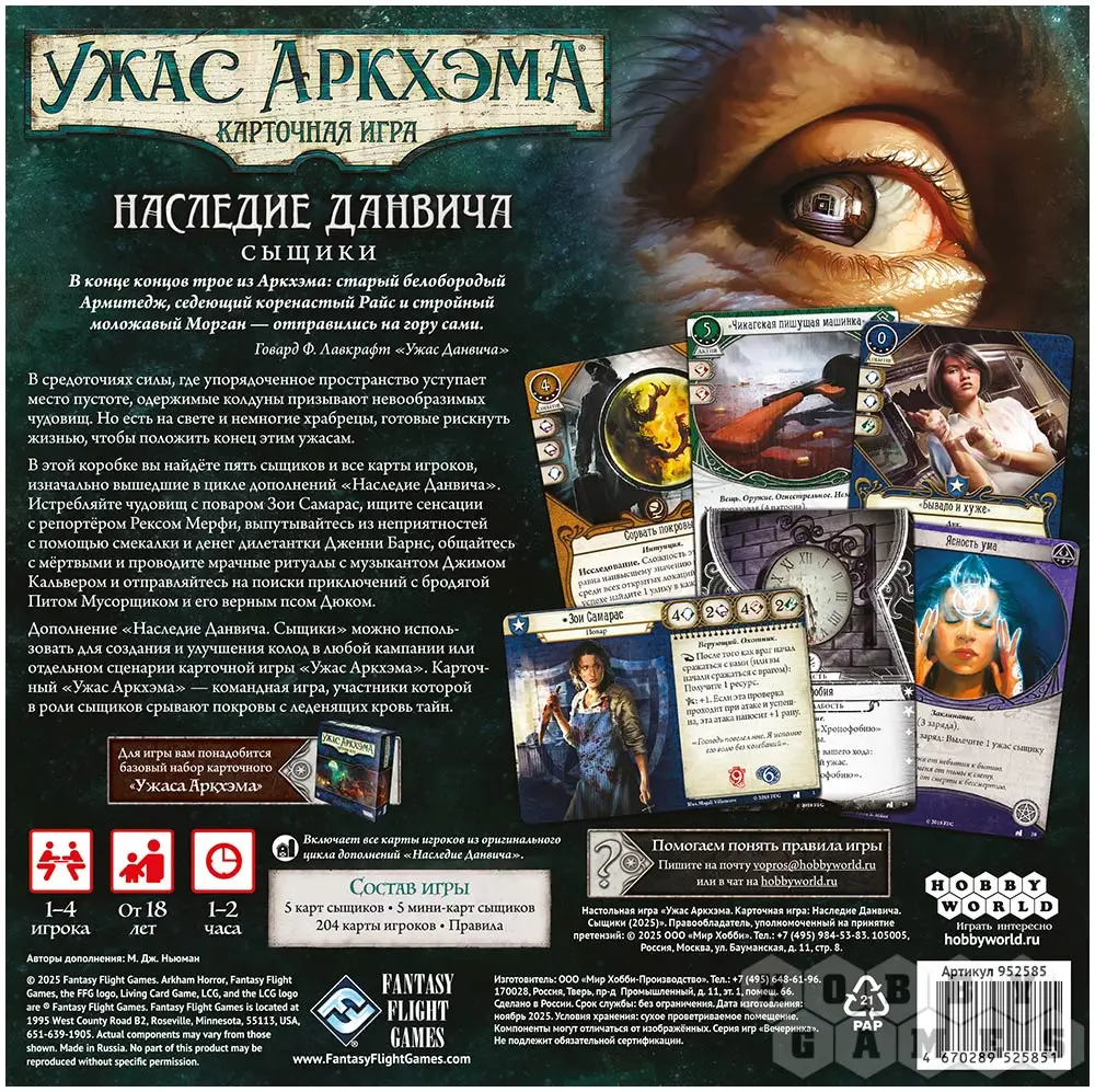 В данном наборе вы найдёте пятерых сыщиков и все карты игроков, что изначально выходили в составе отдельных дополнений цикла "Наследие Данвича". Внутри коробки вас ждут;