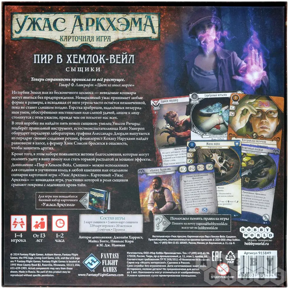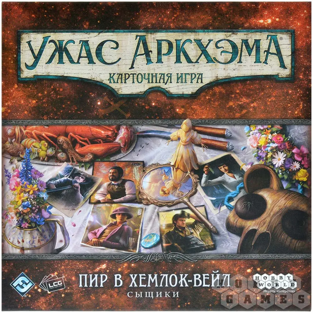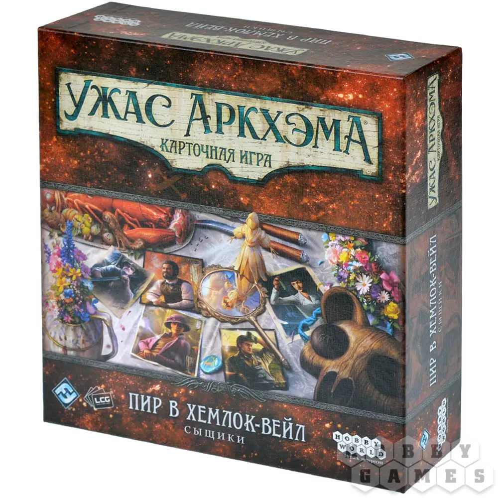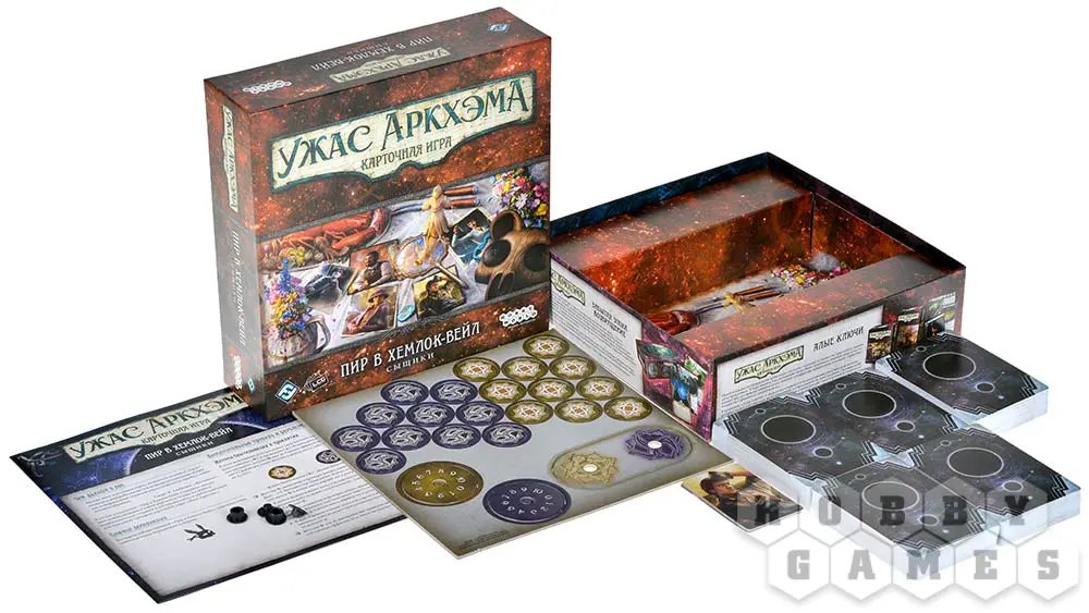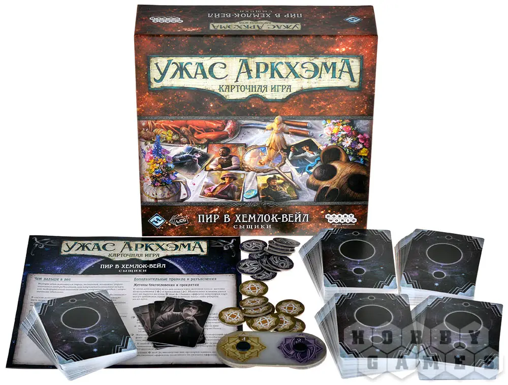 Обратите внимание! Это дополнение включает только карты сыщиков и карты игроков. Тексты и карты сценариев цикла "Пир в Хемлок-Вейл" объединены в отдельный набор:
