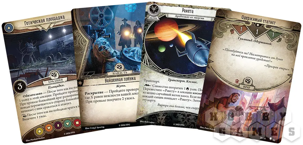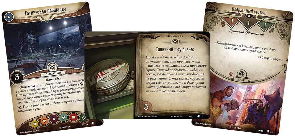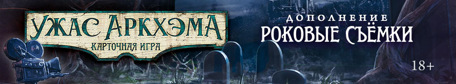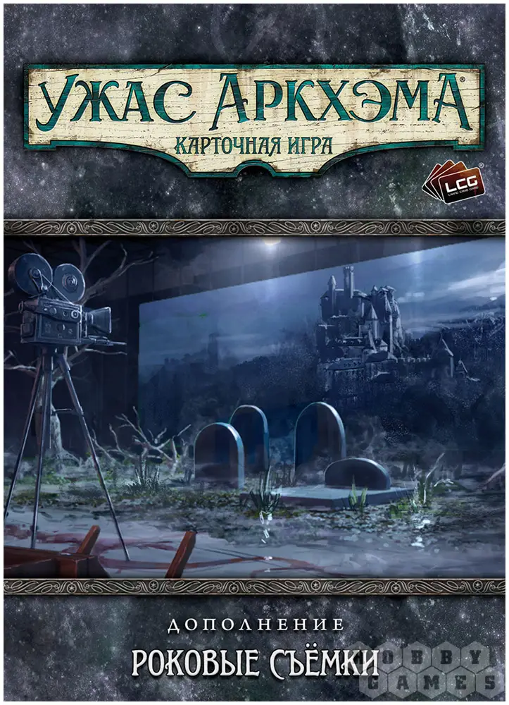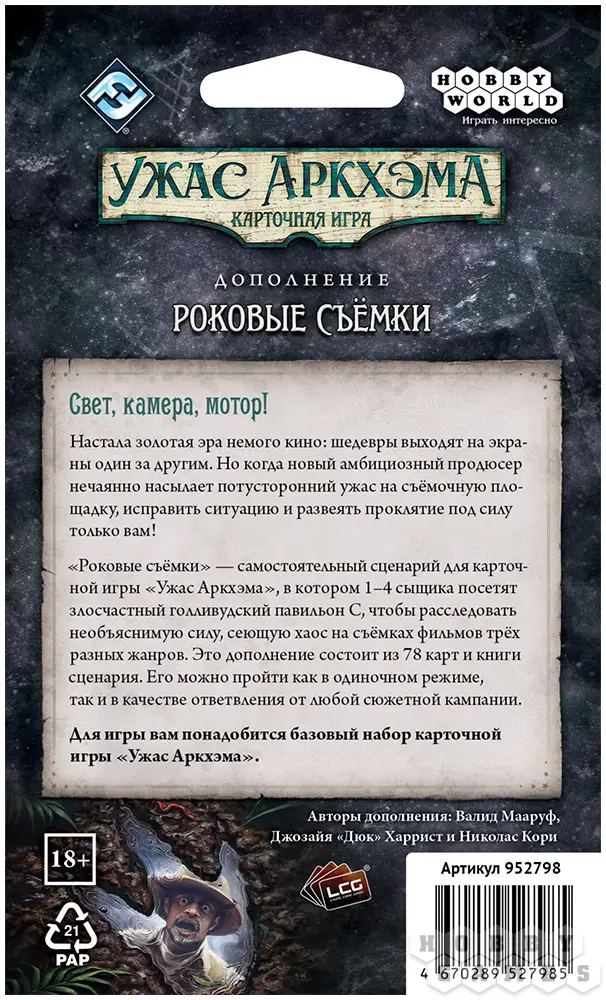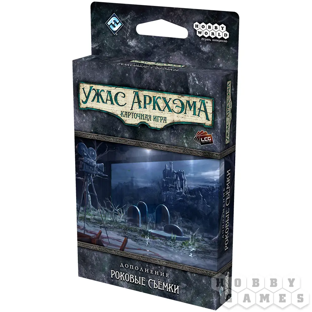 "Роковые съёмки" – самостоятельный сценарий для карточной игры "Ужас Аркхэма", который перенесёт вас в злосчастный голливудский павильон. Внутри вас ждёт книга сценария и 78 карт, а главное – возможность погрузиться в атмосферу трёх киножанров одновременно. Расследуйте таинственную силу, сеющую хаос на площадке, и попытайтесь отличить реквизит от смертельной опасности, пока режиссёр не крикнул: "Снято!"