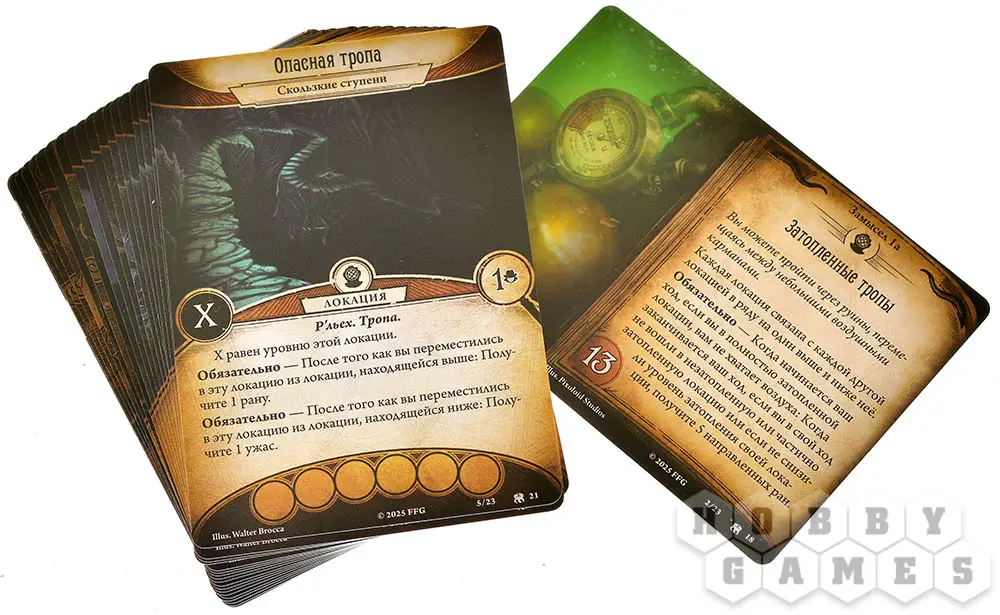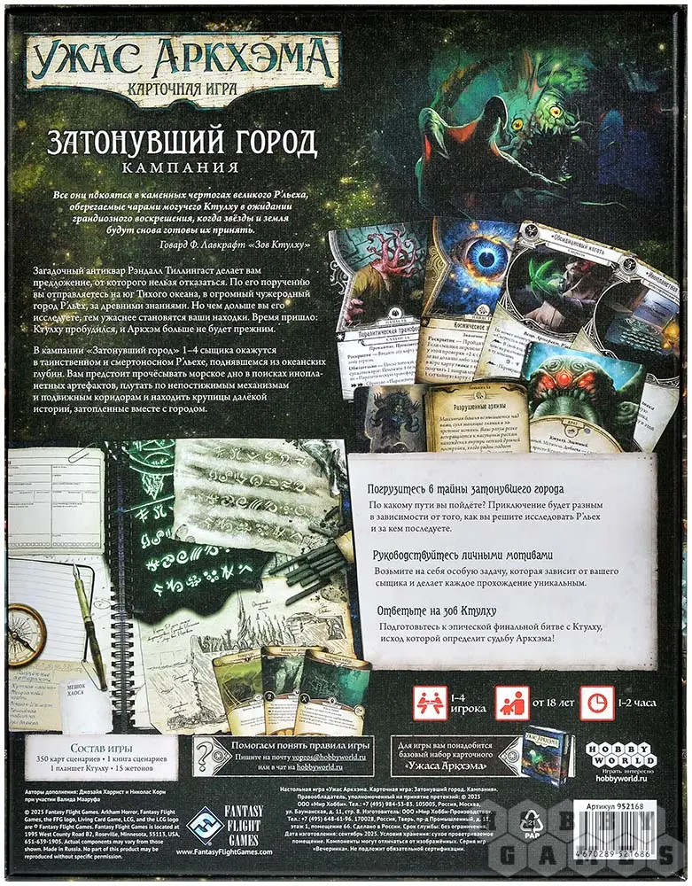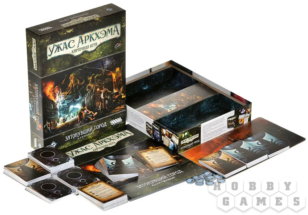 "Затонувший город" – масштабная сюжетная кампания для карточной игры "Ужас Аркхэма", где вас ждёт совершенно новое приключение. Вы будете плутать по меняющимся локациям Р’льеха, исследовать морское дно в поисках инопланетных реликвий и принимать решения, которые определят ход истории.