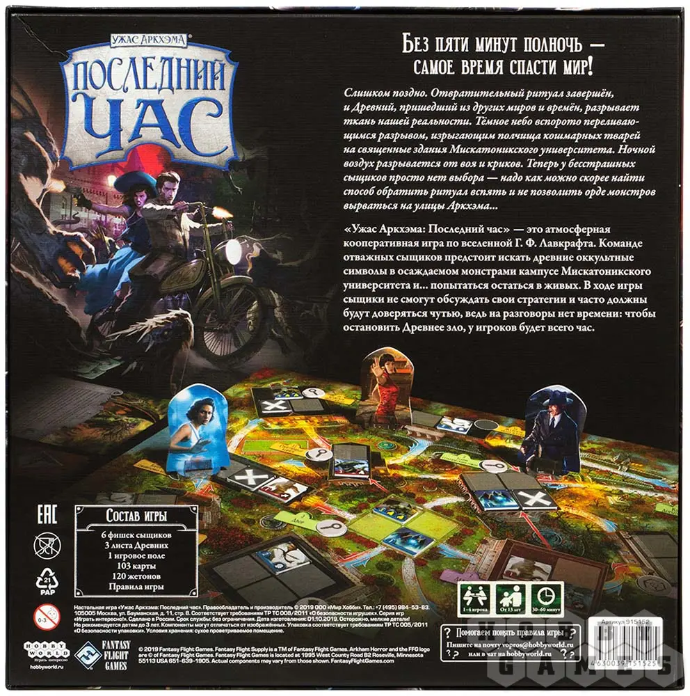 "Ужас Аркхэма: Последний час" – это быстрая кооперативная настольная игра, в которой сыщикам необходимо сдерживать натиск монстров и искать подсказки, необходимые для обращения ритуала вспять. Количество времени при этом ограничено, вы должны справиться с задачей всего за час (8 раундов), иначе потерпите поражение. Игра не имеет ничего общего с другой игрой "Ужас Аркхэма" кроме сеттинга – действие игры происходит в мире Говарда Лавкрафта, где древние и забытые ужасы скрываются от нас за пеленой реальности, а детективы балансируют на грани сумасшествия.