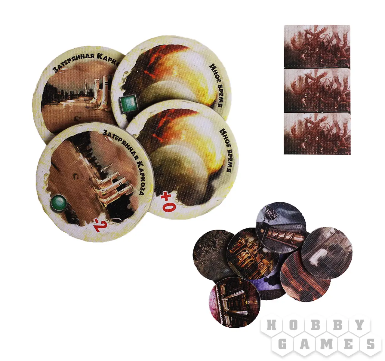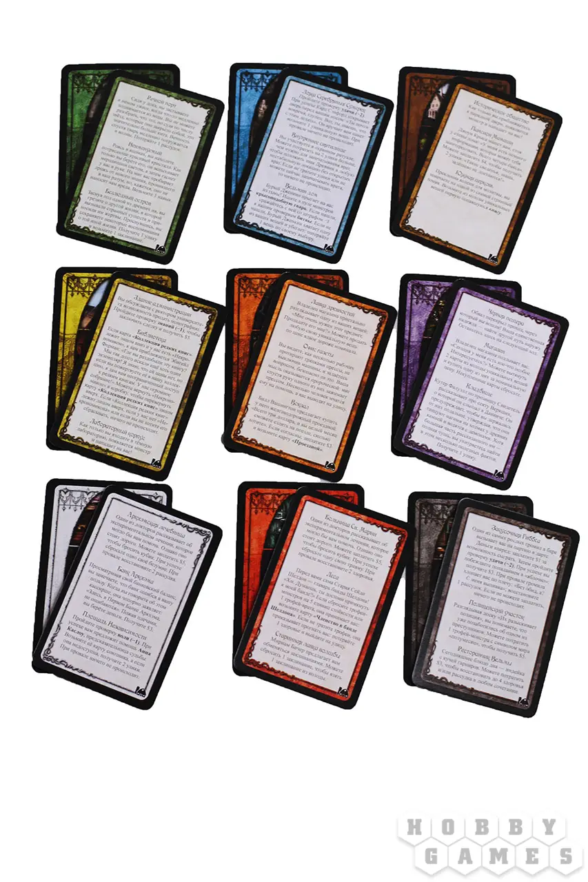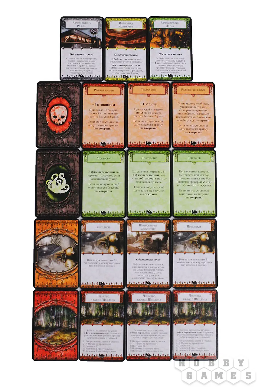 4 карты состояний обозначают долгосрочные преимущества и обстоятельства. В самом начале игры они выкладываются рубашкой вверх и активируются, когда персонаж посещает определённые локации.