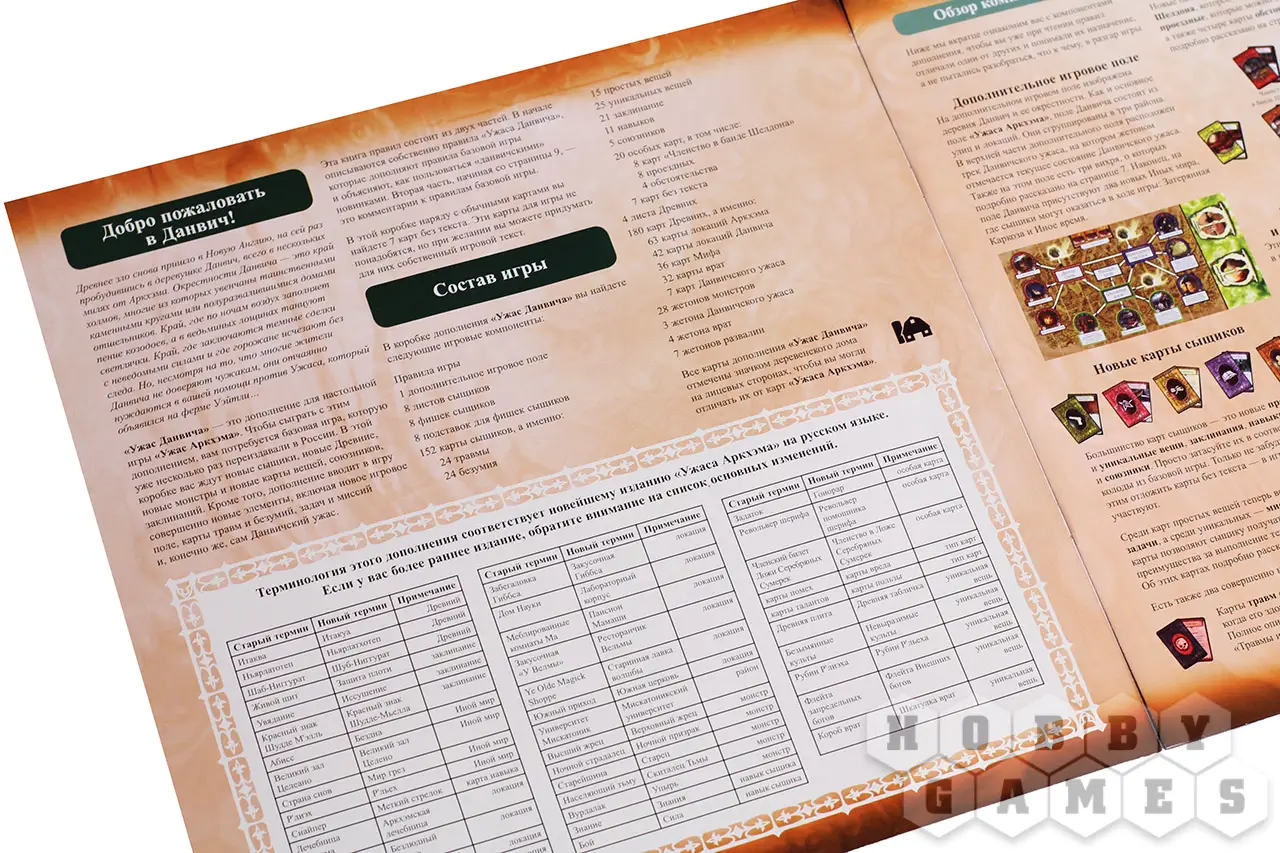 Дополнительное поле представляет собой карту нового города. Большое количество карт новых контактов в самом Аркхэме и карты контактов в локациях Данвича. Также стоит отметить, что поля базовой игры и дополнения объединяются, а игроки получают возможность легко путешествовать с вокзала Аркхэма в зловещий Данвич.