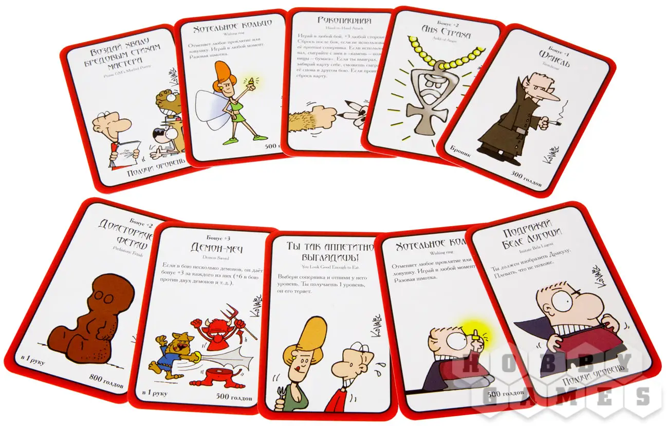 Итак, настольная игра "Манчкин" – это ролевая игра по форме, пародия по содержанию. Манчкины игроков ходят по подземелью, вытаскивают на свет божий тамошних чудовищных обитателей и либо раскаиваются в этом, либо получают за победу новые уровни и сокровища. Исход каждого подобного приключения (боя, короче) зависит от того, кто с чем на бой вышел. У игрока это уровень и бонусы/штрафы от шмоток, класса, расы и проклятий. У монстра это уровень плюс карты-усилители и разовые шмотки. Откуда шмотки у монстра? В Вашем бою могут принять участие и завистливые соперники: они могут помогать монстру и ослаблять вас. Поэтому, хотя в "Манчкин" и можно играть вдвоём, наберите на матч побольше народу: на руках будет больше проклятий, усилителей и зелий, которыми так легко изменить баланс сил в бою в любую сторону, и бдительные завистники не дадут никому из Вас выйти в единоличные лидеры гонки к 10-му победному уровню.