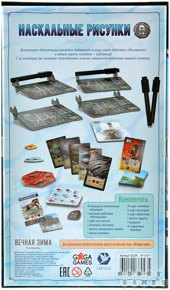 Вам было скучно играть с базовыми механиками? Тогда это дополнение точно для вас! В нём добавлено то, что прекрасно отображает дух древности – наскальные рисунки! К уже привычным компонентам игрока добавляется двухсторонний планшет, а к ряду возможных действий ещё одно – рисование. Вы будете закрашивать на своём планшете точки, отмечая прогресс общины, и соединять их линиями. В конечном результате у вас появится живописное изображение животного вашего племени. Ну или гигантского мамонта. В общем, что вам будет по душе.