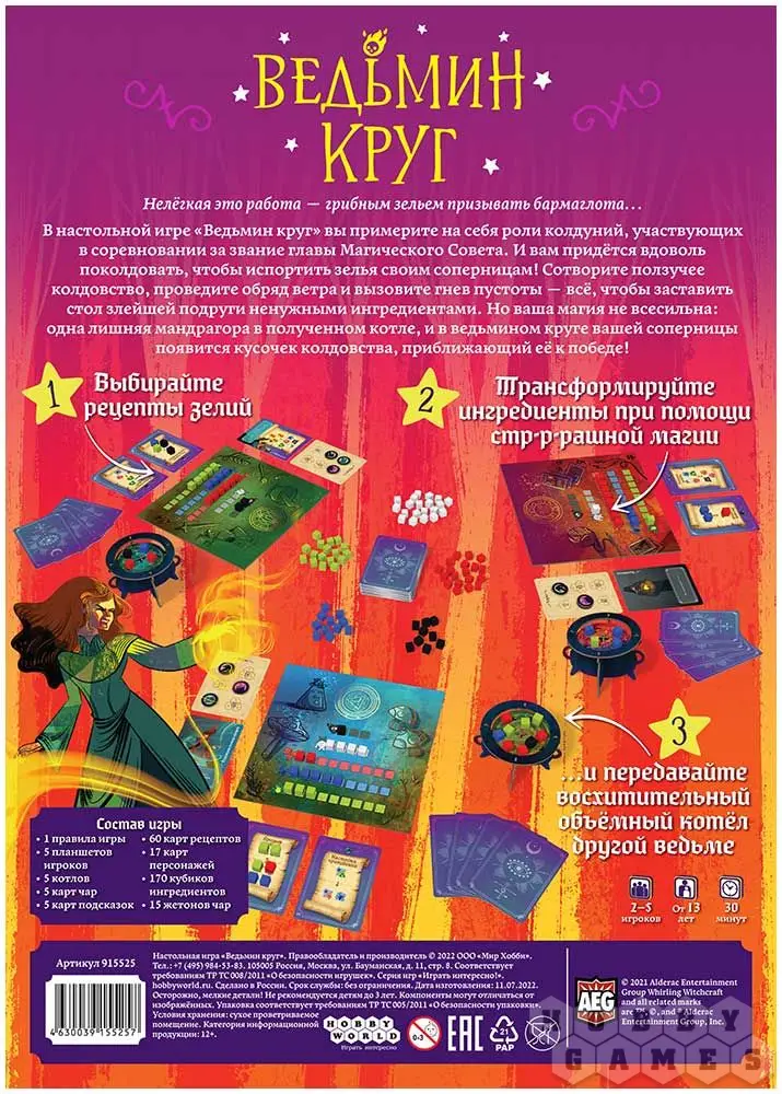 “Ведьмин круг” – это игра, в которой придётся вдоволь поколдовать, чтобы заполучить звание главы Магического Совета. Этот титул достанется ведьме, что сварит самое лучшее магическое зелье, а потому необходимо грамотно распоряжаться рецептами зелий, трансформировать ингредиенты... И творить невероятные пакости!