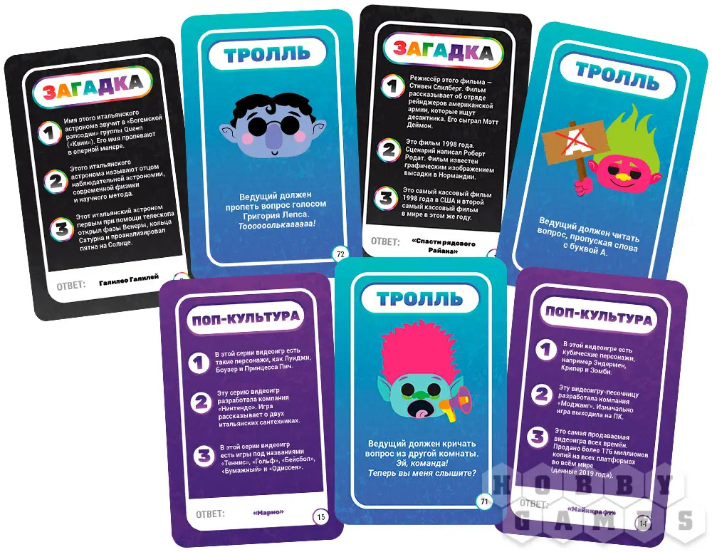 "Виктроллина" – это веселая вечериночная настолка с простыми правилами, которая отлично подойдёт для большой компании. Игрокам нужно будет разделиться на две команды, одна из которых будет заниматься ответами на вопросы, а другая – мешать им, троллить и всячески хулиганить.