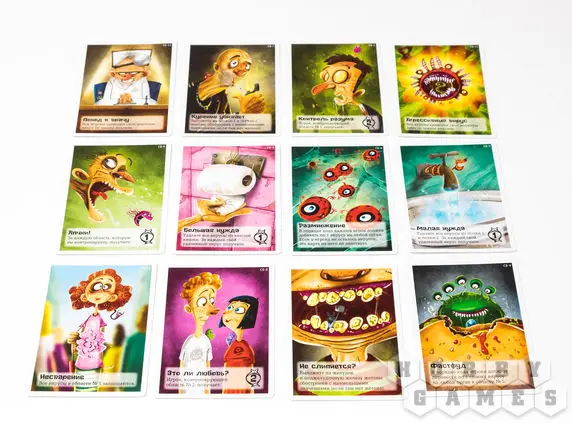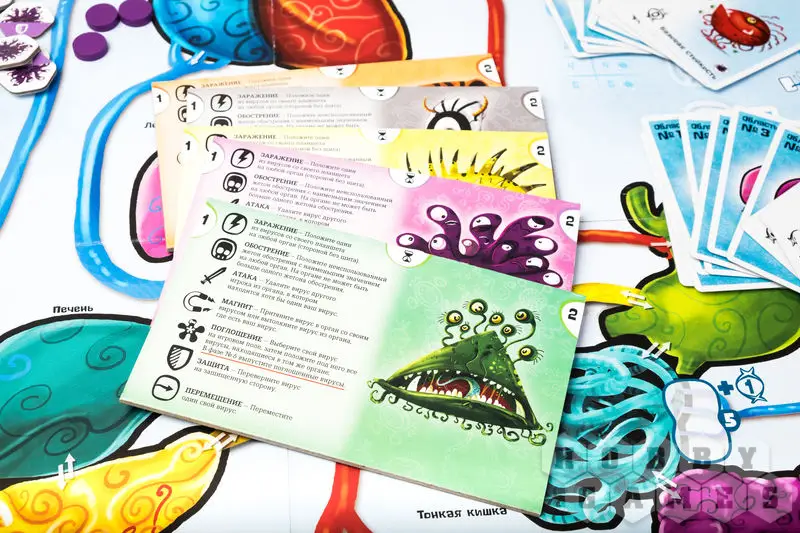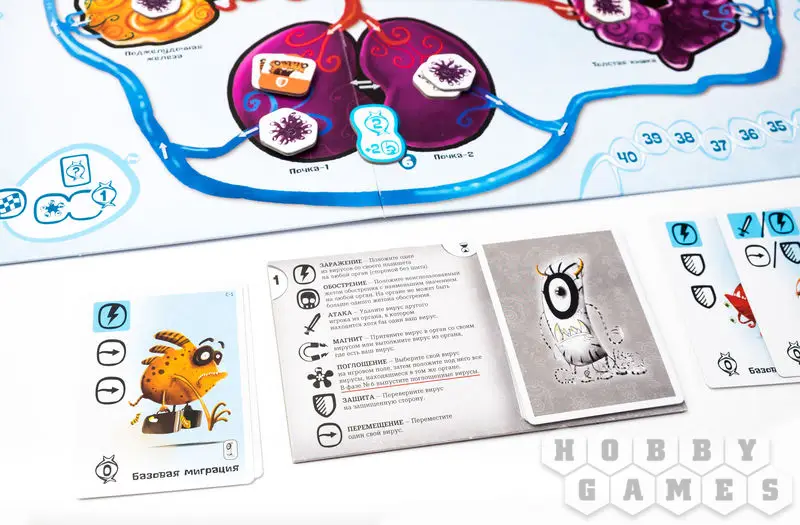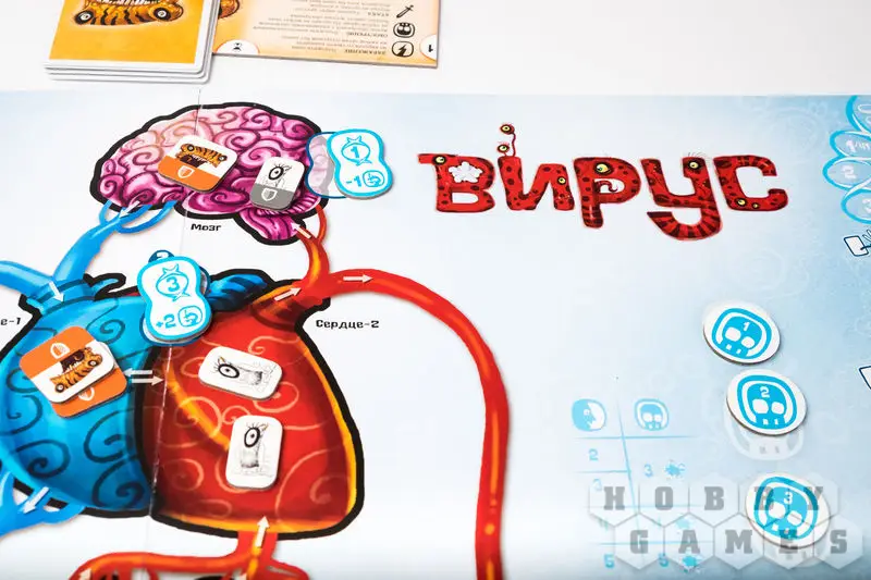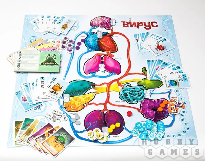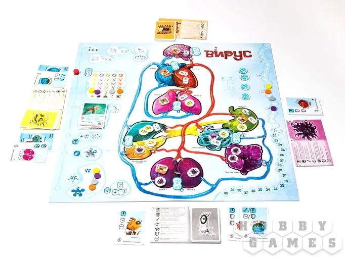 "Вирус" - соревновательная настольная игра для 2-5 игроков. В этой игре вы принимаете на себя роль вирусов, поселившихся в организме человека. Каждый ход игроки добавляют в организм новых бойцов, перемещают их по всему телу и сражаются с соперниками за контроль над органами пациента. Но не забывайте, что ваши успехи привлекают внимание врачей и иммунной системы!