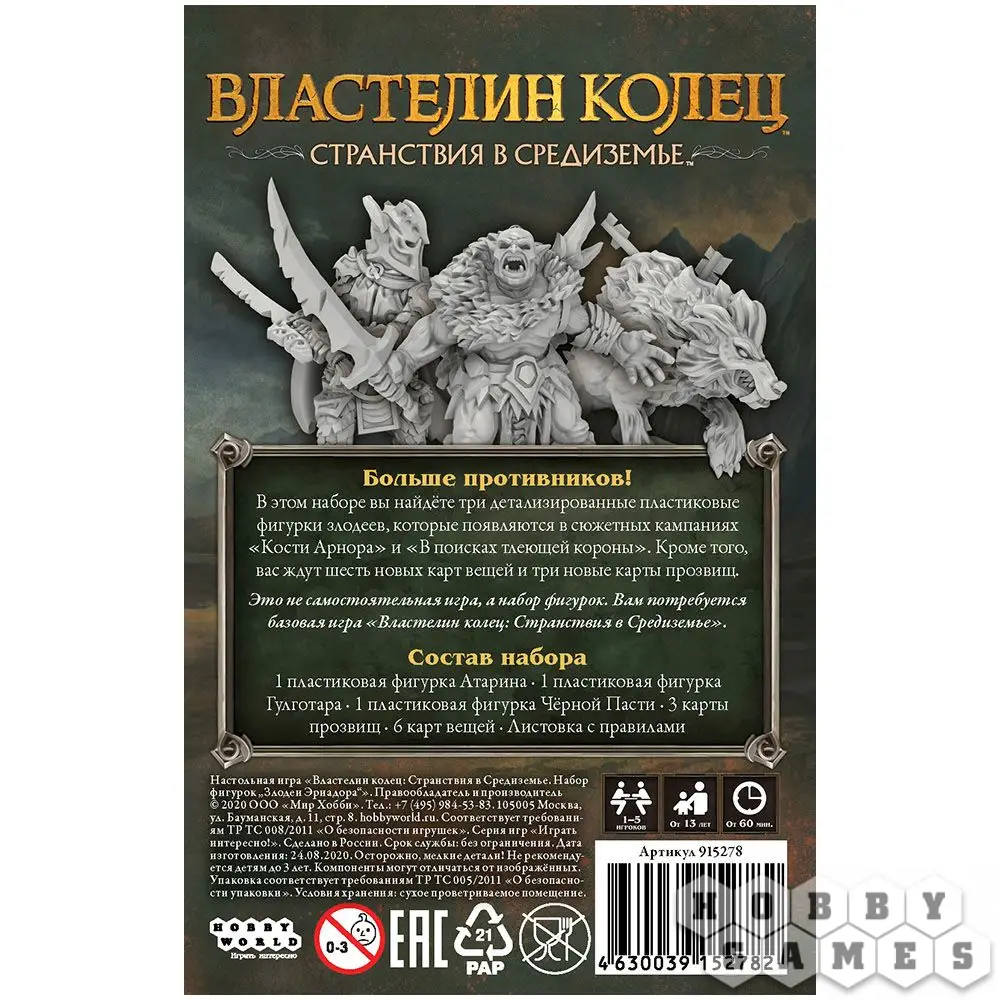 Перед вами дополнительный набор для игры "Властелин колец: Странствия в Средиземье", в котором вы найдёте уникальные пластиковые фигурки врагов из кампаний "Кости Арнора" и "В поисках тлеющей короны". В этот набор также входят новые карты вещей и прозвищ, которые добавятся к базовым картам аналогичных типов.