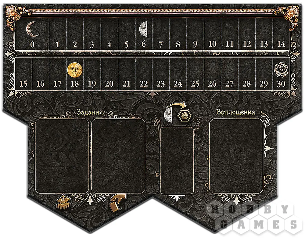 Чтобы определить, кто же станет новым Великим Магистром ложи Чёрной Розы, в конце игры необходимо подсчитать все очки силы. В конце игры к уже набранным очкам силы прибавьте очки за выполненные задания, полученные трофеи, за жетоны активаций разрушенных комнат и корону первого игрока. В случае ничьей после подсчёта всех очков силы, новым Магистром становится претендент, выполнивший больше всех заданий. Если и в этом случае ничья – победитель определяется по количеству собранных трофеев. Но если ничья и в этом случае, то обладатель жетона с короной определяет, кто из претендентов становится Великим Магистром Чёрной Розы.