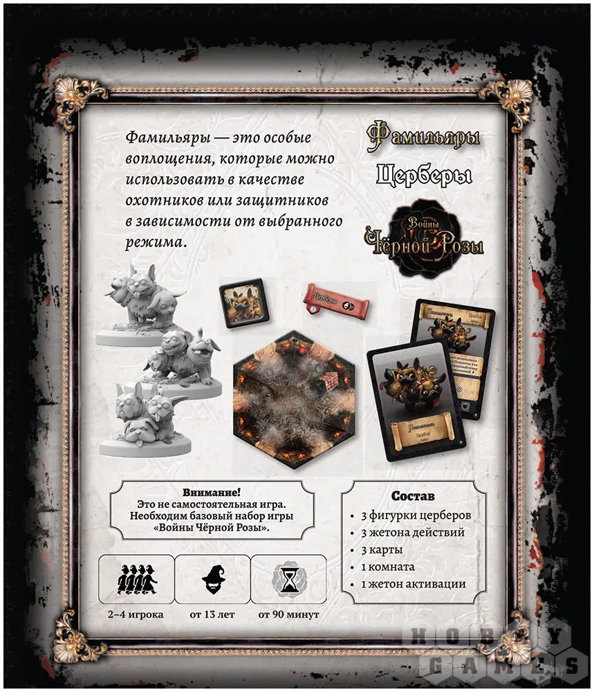 "Войны Чёрной Розы. Фамильяры: Церберы" пополняет список призываемых воплощений тремя милейшими щеночками. Ой, то есть церберами – Польпетта, Муза и Арго. Это фамильяры, которые отличаются от обычных воплощений тем, что маг может использовать их двумя разными способами, в зависимости от выбранного им режима: фамильяр используется в режиме защитника, когда находится в одной комнате вместе со своим призывателем – находясь в этом режиме, фамильяр не может стать отдельной целью. Однако когда маг получает урон, он может распределить его полностью между собой и фамильяром как угодно. В режим охотника фамильяр переходит в момент, когда остаётся в комнате без мага, который его призвал. Будучи охотником, фамильяр подчиняется обычным правилам воплощения: он может становится целью и получает весь урон. Но когда маг получает урон больше, чем у него осталось здоровья, он обязан адресовать излишки урона своему фамильяру, даже если тот находится в режиме охотника.