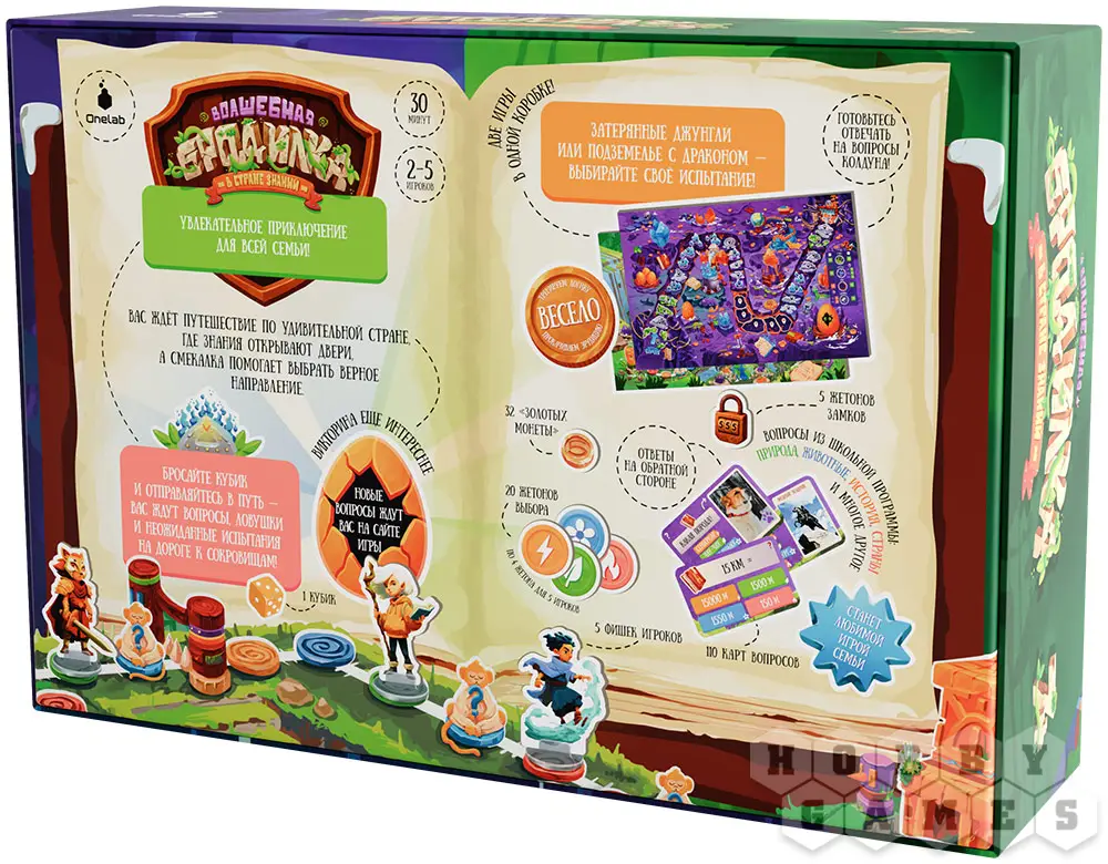 "Волшебная бродилка в стране знаний" – это классическая игра-ходилка с элементами викторины для детей от семи лет и их родителей. Вас ждут два поля на выбор, а значит, два уникальных приключения, каждое из которых можно проходить снова и снова! Просто потратьте пару минут на объяснение правил, выберите, куда отправитесь сегодня, и начинайте играть!