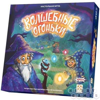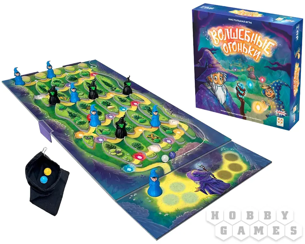 "Волшебные огоньки" – это кооперативная настольная игра для детей, которая привлекает внимание своим оформлением, компонентами и простым, но увлекательным игровым процессом. На игровом поле стоят фигурки учеников волшебной школы и ведьм – все они хотят добраться до дома волшебника быстрее остальных. А идти они будут по тропинкам, которые сделаны неглубокими дорожками. Достаньте из мешочка случайный шарик, поставьте в начало любой тропинки и толкните, чтобы он покатился. Какие фигурки он заденет, те и будут двигаться по тропинке. Но переместятся они на клетку того же цвета, что и шарик, который их коснулся. Принимайте совместные решения, по какой тропинке катить шарики и постарайтесь сделать так, чтобы ведьмам не достался волшебный посох Балдуина!