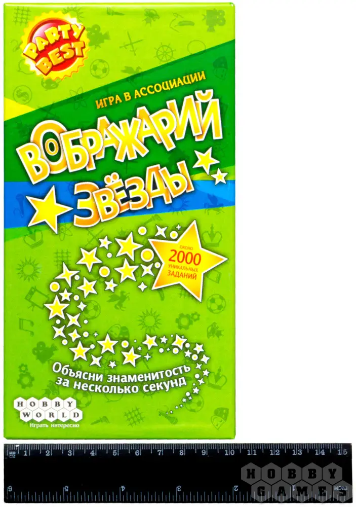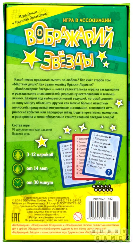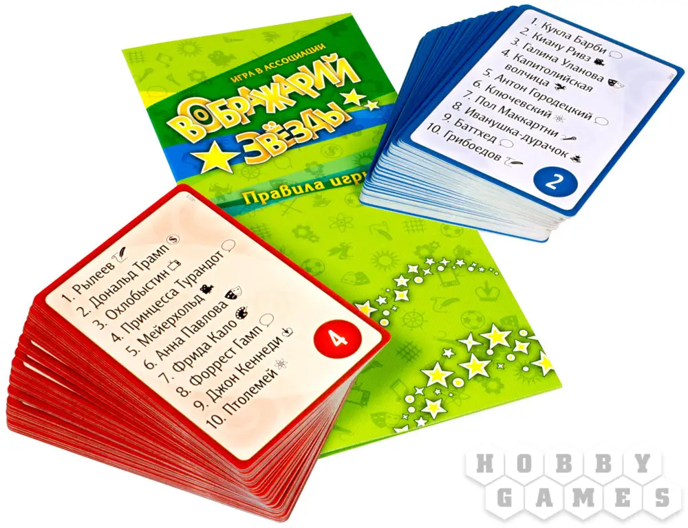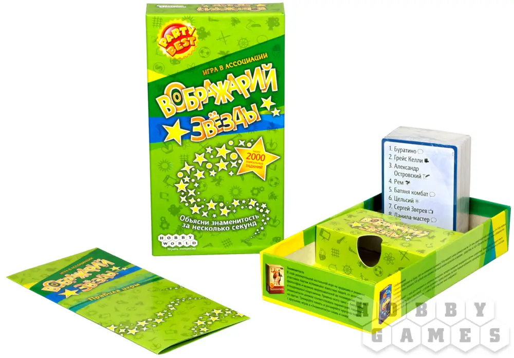 "Воображарий: Звёзды" – это продолжение популярной и очень успешной игры в ассоциации от нашего издательства. Процесс игры представляет собой загадывание и разгадывание различных знаменитых персоналий, как реально существовавших, так и вымышленных. В отличие от "Активити" или "Элиаса", где соревнуются команды, в этой игре все играют за себя. Каждый ход выбирается новый игрок, который должен за ограниченное время объяснить как можно больше загаданных личностей. Для этого можно придумывать интуитивные ассоциации, вспоминать исторические события, связанные с ними, или просто пародировать звёзд – всё, что только придёт вам на ум. Эта игра точно станет гвоздём любой вечеринки, а семейный вечер превратит в настоящий незапланированный праздник!