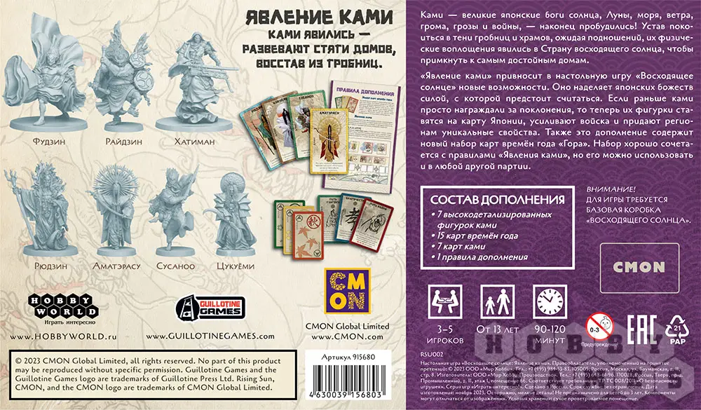 Перед вами большое дополнение для "Восходящего солнца", которое сильно расширяет игру и правила. Расширение делает влияние ками на игру гораздо более сильным и важным. Если раньше влияние ограничивалось бонусами, которые они давали самым преданным кланам, то теперь ками получили свои собственные миниатюры, каждая из которых находится в начале игры в своей провинции.