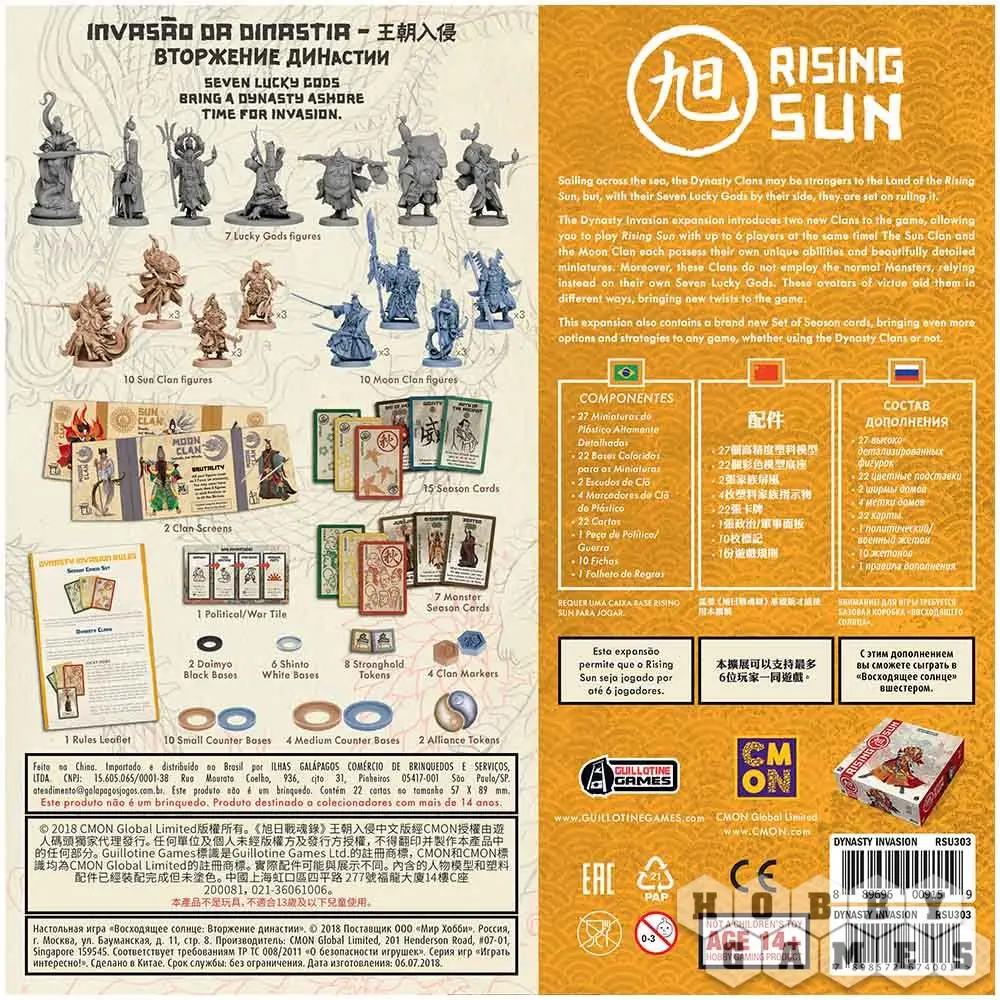 "Вторжение династии" – это свежее дополнение для настольной игры "Восходящее Солнце". Для игры вам, конечно же, потребуется базовая версия, но играть можно и с несколькими дополнениями сразу. Данное расширение сильно освежает игровой процесс, добавляет много новых возможностей и интересных механик.