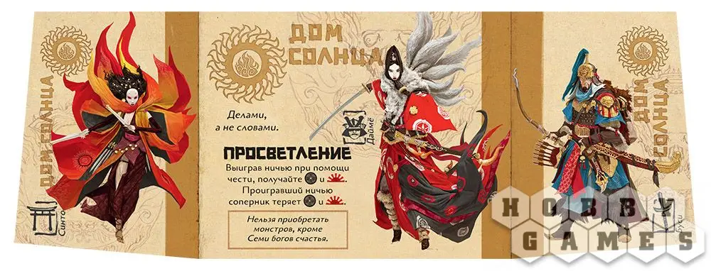 Дом Солнца – просветлённый и предпочитающий путь чести дом, который готов бросить вызов каждому и сыграть в гонку на истощение ресурсов. Каждый раз, когда дом Солнца сравнивает честь с честью другого дома и побеждает, он получит одну монету и одно ПО, а противник потеряет столько же.