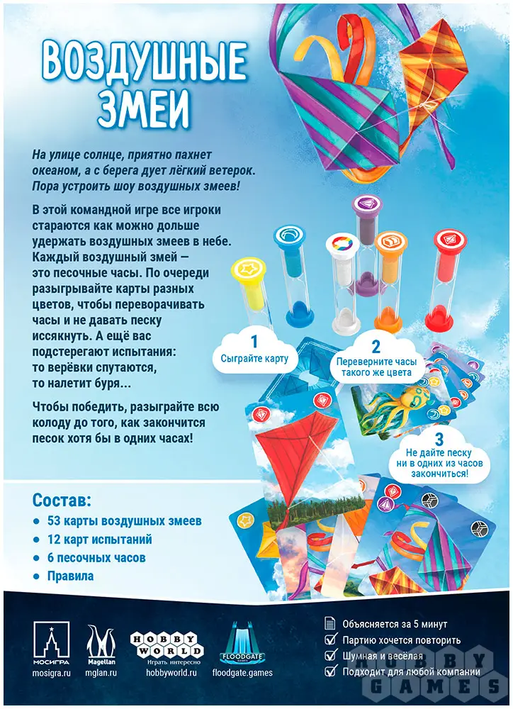 В шумной и весёлой командной игре "Воздушные змеи" вам и вашим друзьям предстоит как можно дольше удерживать в небе воздушных змеев. Они представлены в игре песочными часами, и пока песок ещё остаётся в верхней половине часов – змеи парят в небе. Не дайте им упасть! Переворачивайте часы, разыгрывая карты змеев, и дайте возможность воздушным красавцам парить в небе как можно дольше!